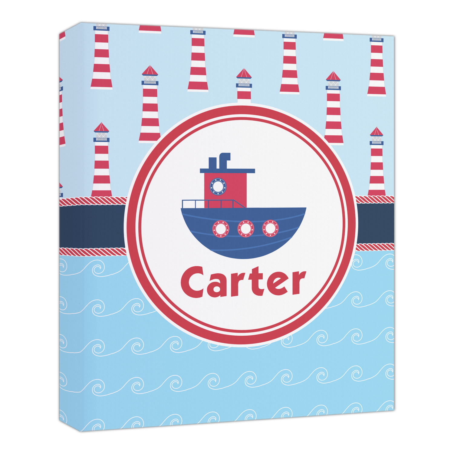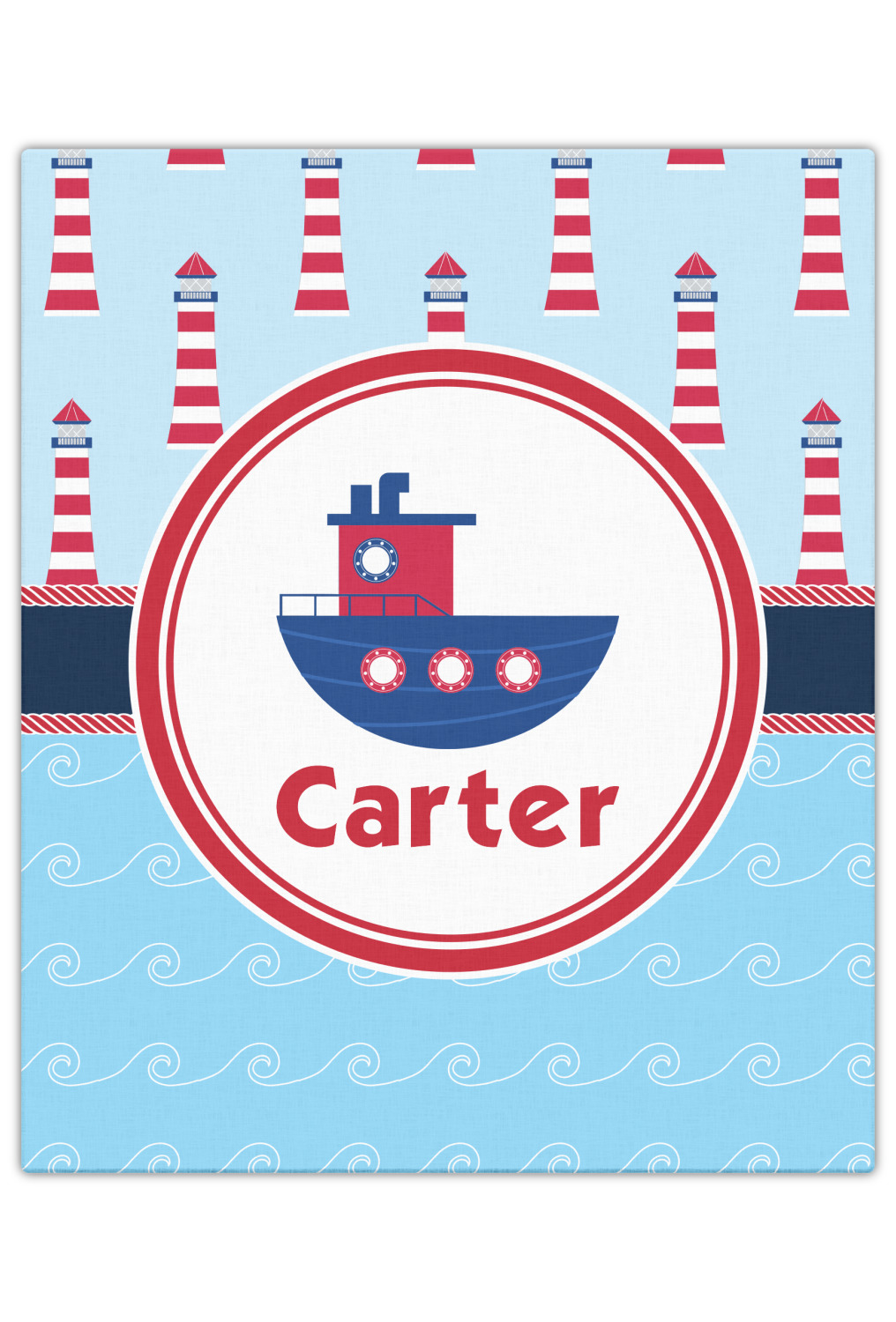 The center focal point of the design is a whimsical coordinating colored tugboat showcased in what looks like a ship's porthole with your personalized name under the tugboat.