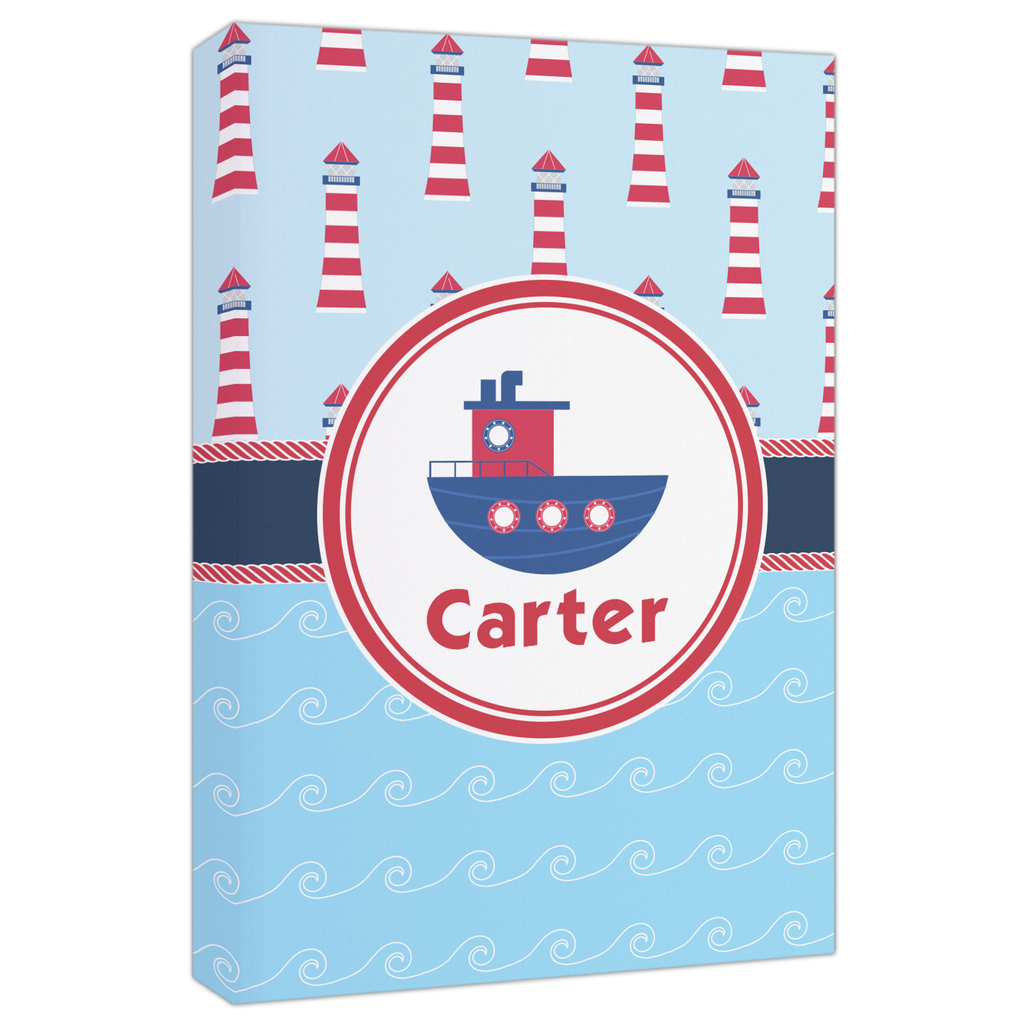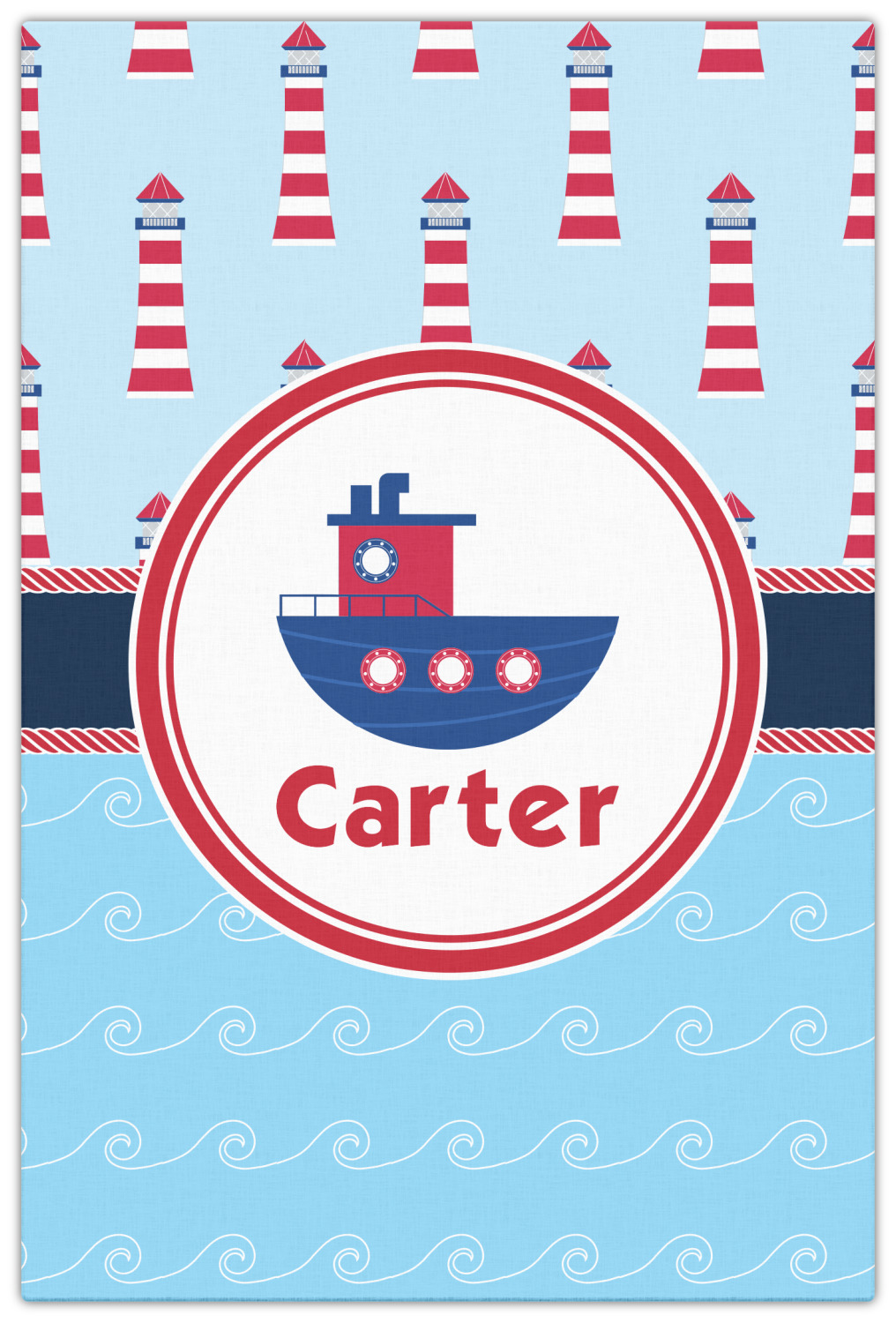 The center focal point of the design is a whimsical coordinating colored tugboat showcased in what looks like a ship's porthole with your personalized name under the tugboat.