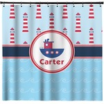 This fun nautical design features a versatile light blue background with a lighthouse pattern on the top with coordinating light blue ocean waves on the bottom. A red stripe with a nautical darker blue rope through the middle brings both patterns together to create a beautiful nautical seascape design.