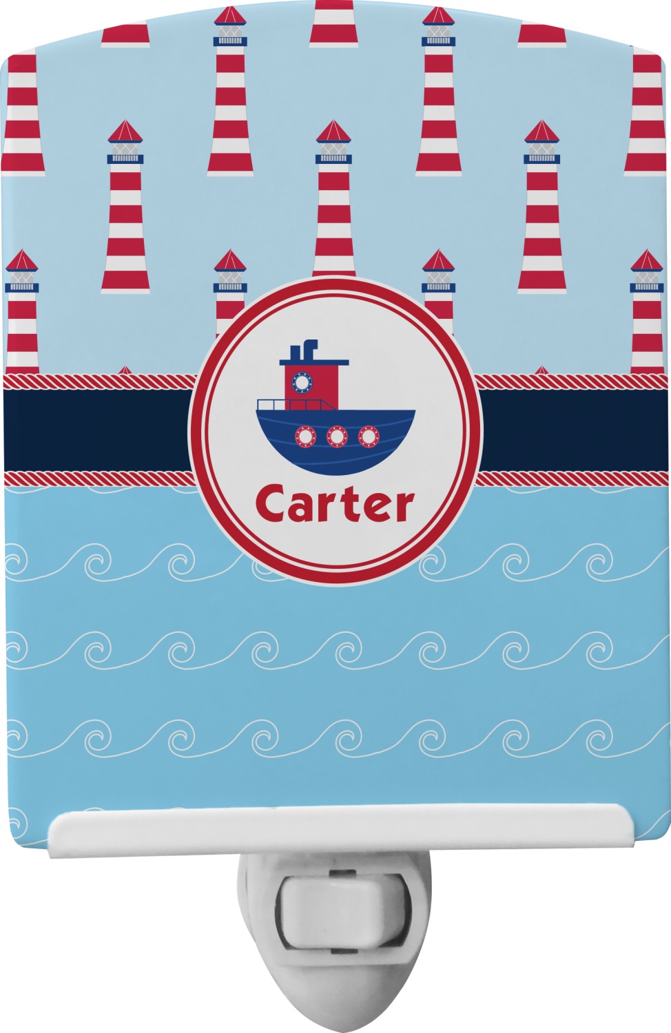 The center focal point of the design is a whimsical coordinating colored tugboat showcased in what looks like a ship's porthole with your personalized name under the tugboat.