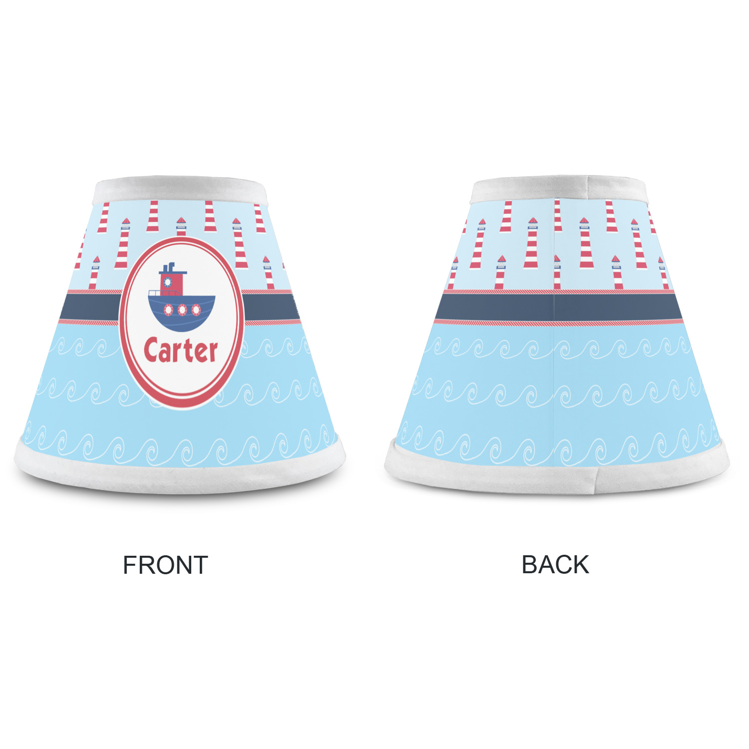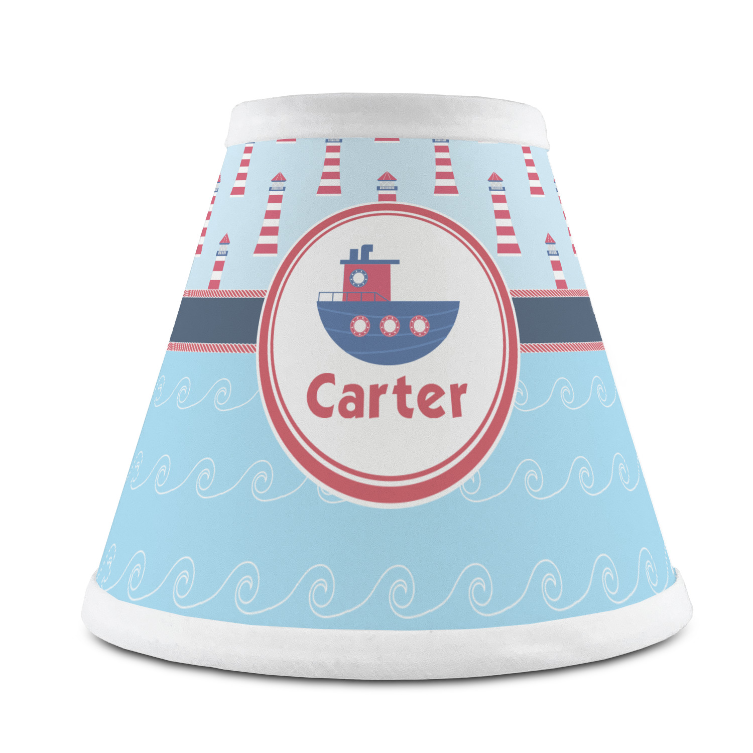 The center focal point of the design is a whimsical coordinating colored tugboat showcased in what looks like a ship's porthole with your personalized name under the tugboat.