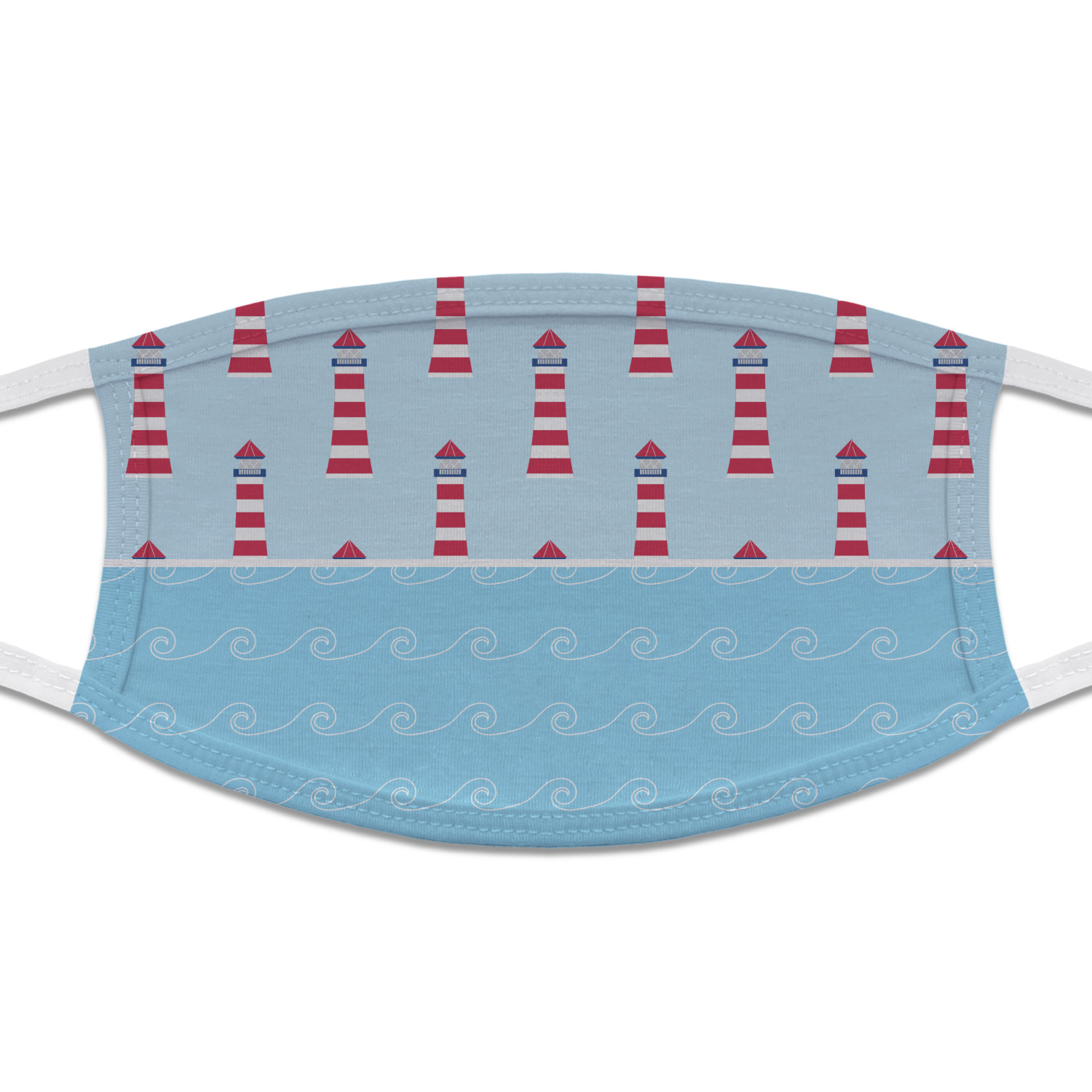 This fun nautical design features a versatile light blue background with a lighthouse pattern on the top with coordinating light blue ocean waves on the bottom. A red stripe with a nautical darker blue rope through the middle brings both patterns together to create a beautiful nautical seascape design.