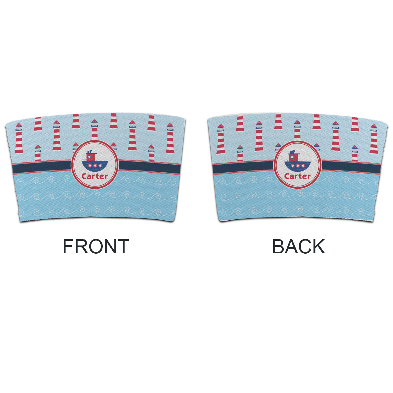 The center focal point of the design is a whimsical coordinating colored tugboat showcased in what looks like a ship's porthole with your personalized name under the tugboat.