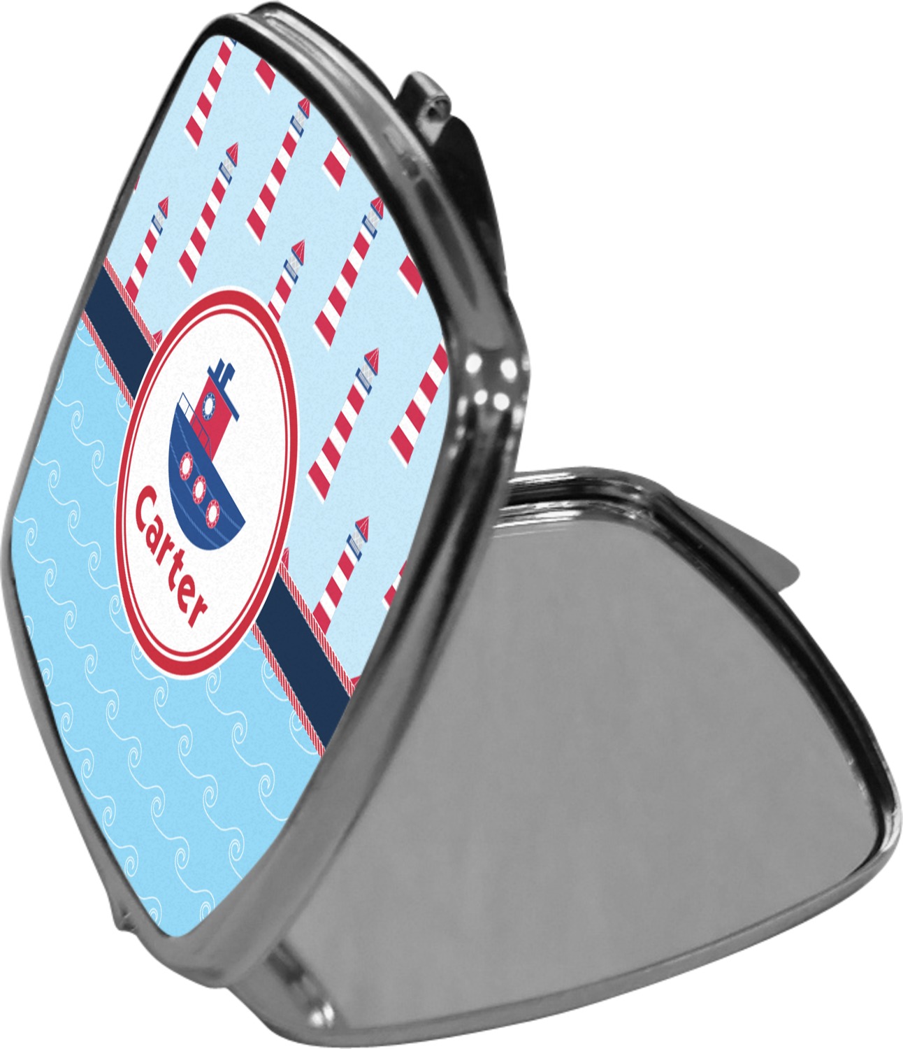 Our compact mirrors are customized with your design on one side. The other side is patterned silver tone metal. Inside, there are two mirrors.
