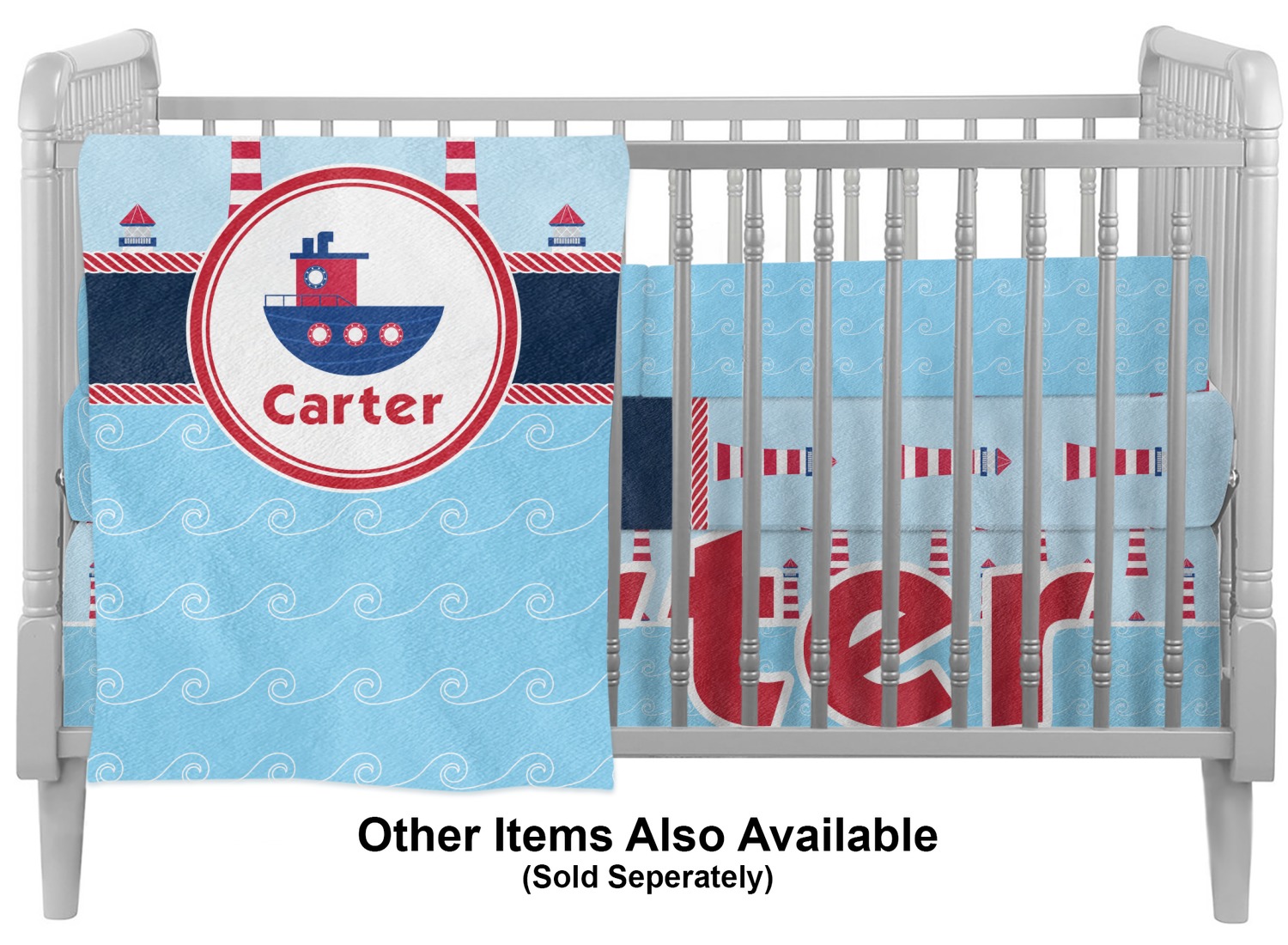 The center focal point of the design is a whimsical coordinating colored tugboat showcased in what looks like a ship's porthole with your personalized name under the tugboat.