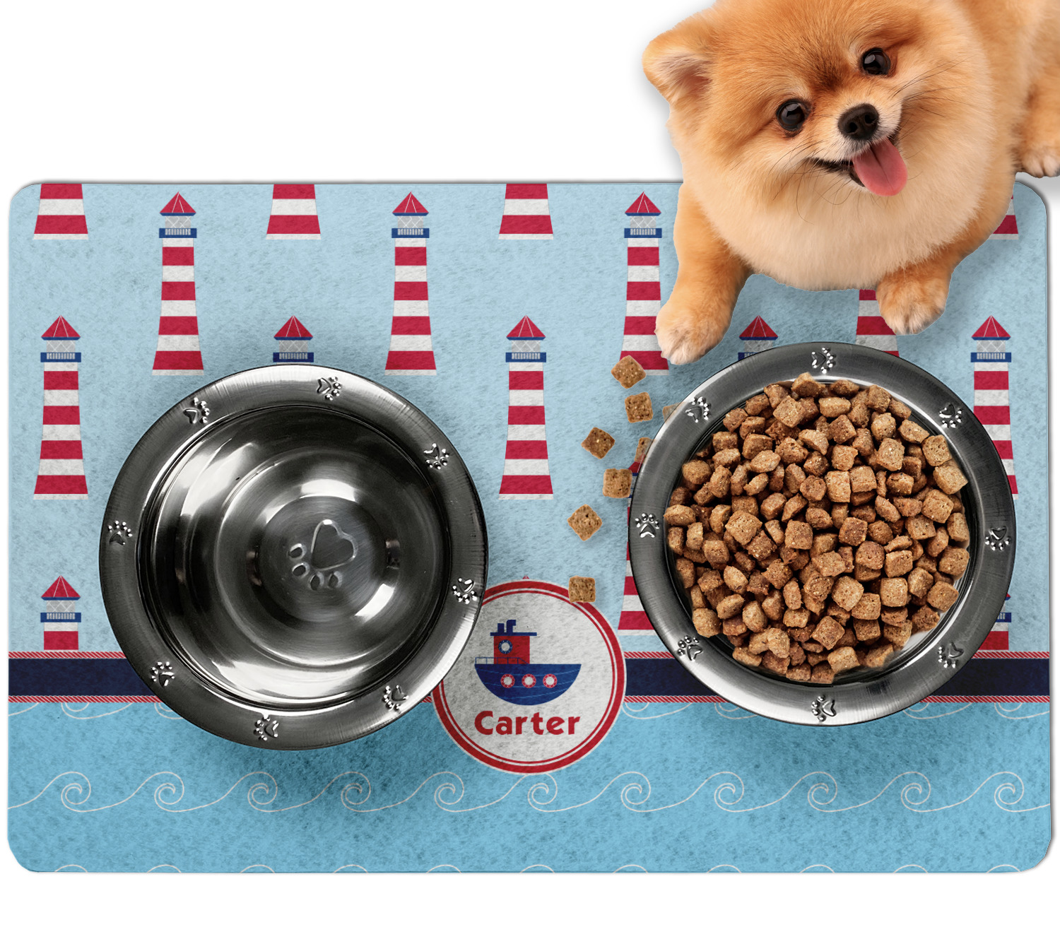 This dog bowl mat, fabricated from polyester, proudly displays your customized design on its top, while its bottom includes a non-slip rubber. This feature allows it to remain firmly in place, even when your dog spills his/her water. With 3 sizes available (18" x 12", 24" x 18", 30" x 24"), the pet food mat has ample space for both a food and water bowl for any sized dogs. Though specified for dogs' use, these mats are also a splendid option for cats.
