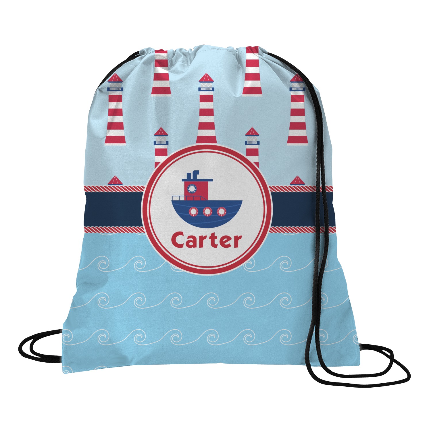 The center focal point of the design is a whimsical coordinating colored tugboat showcased in what looks like a ship's porthole with your personalized name under the tugboat.
