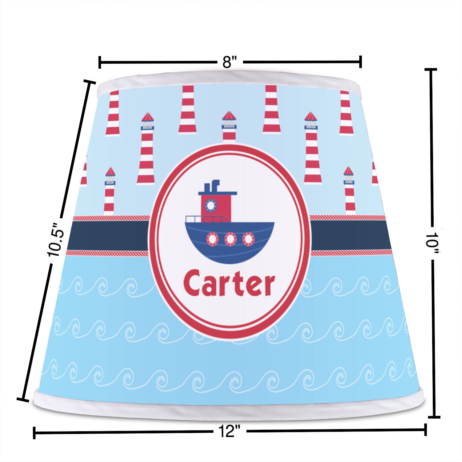 The center focal point of the design is a whimsical coordinating colored tugboat showcased in what looks like a ship's porthole with your personalized name under the tugboat.