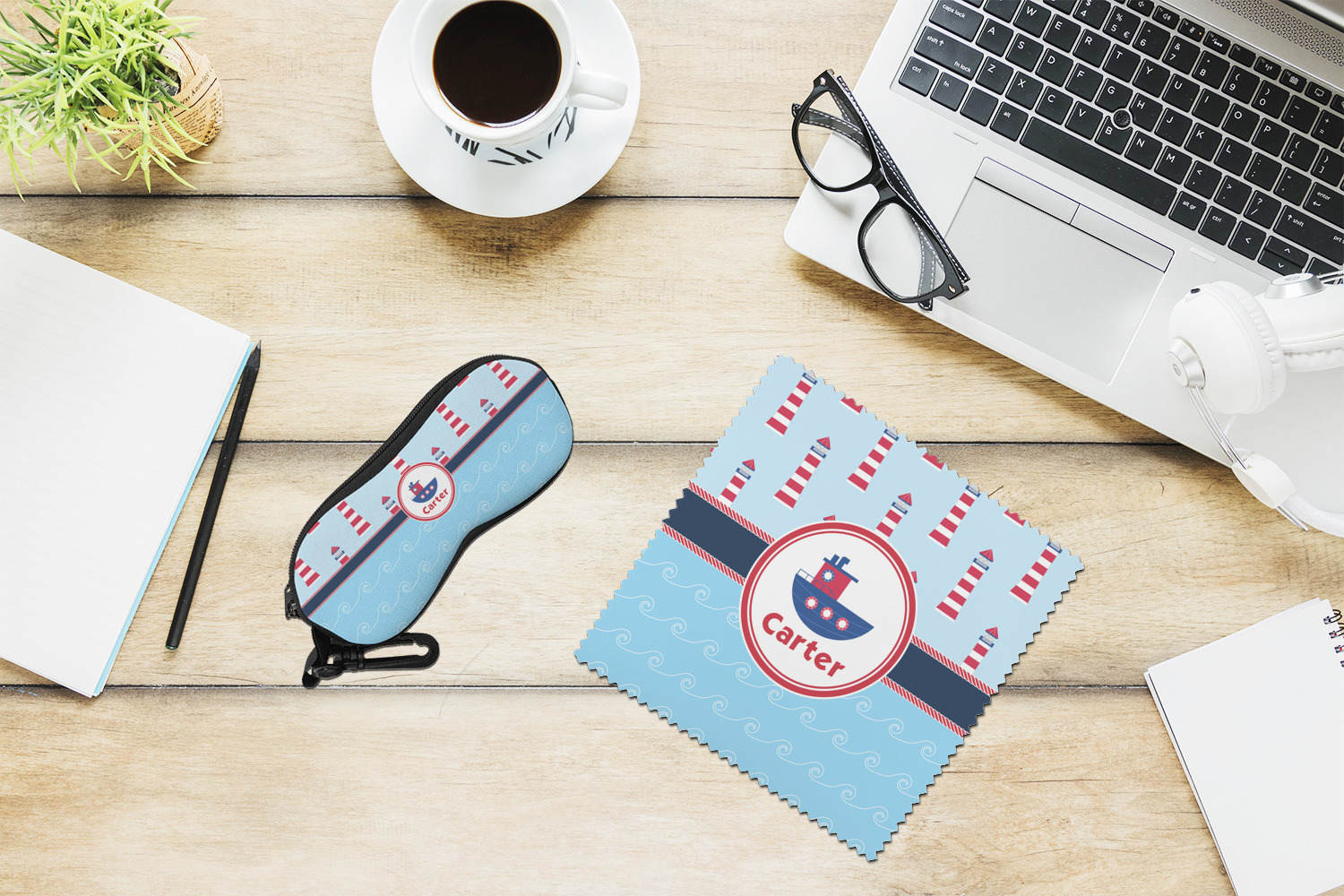 The center focal point of the design is a whimsical coordinating colored tugboat showcased in what looks like a ship's porthole with your personalized name under the tugboat.