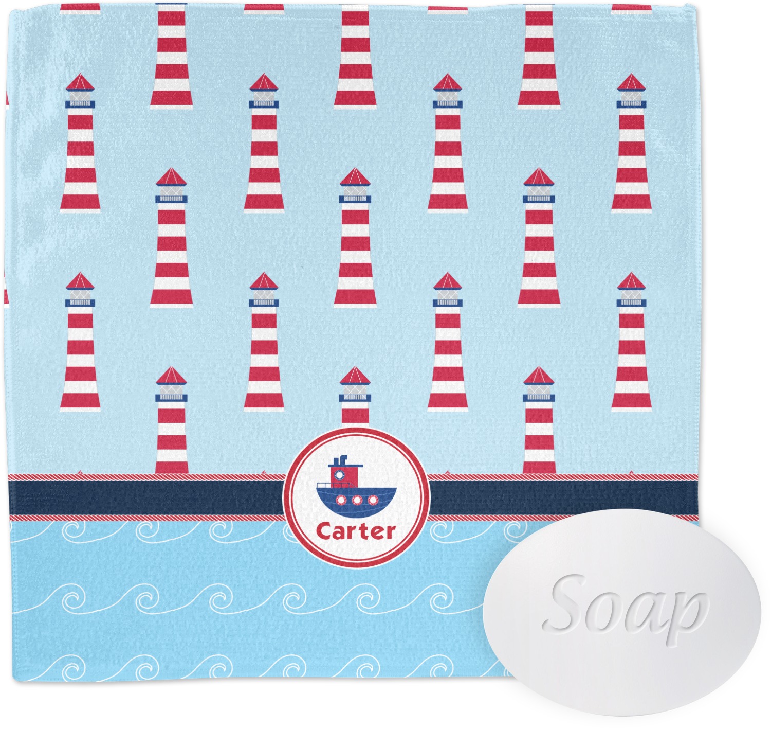The center focal point of the design is a whimsical coordinating colored tugboat showcased in what looks like a ship's porthole with your personalized name under the tugboat.