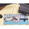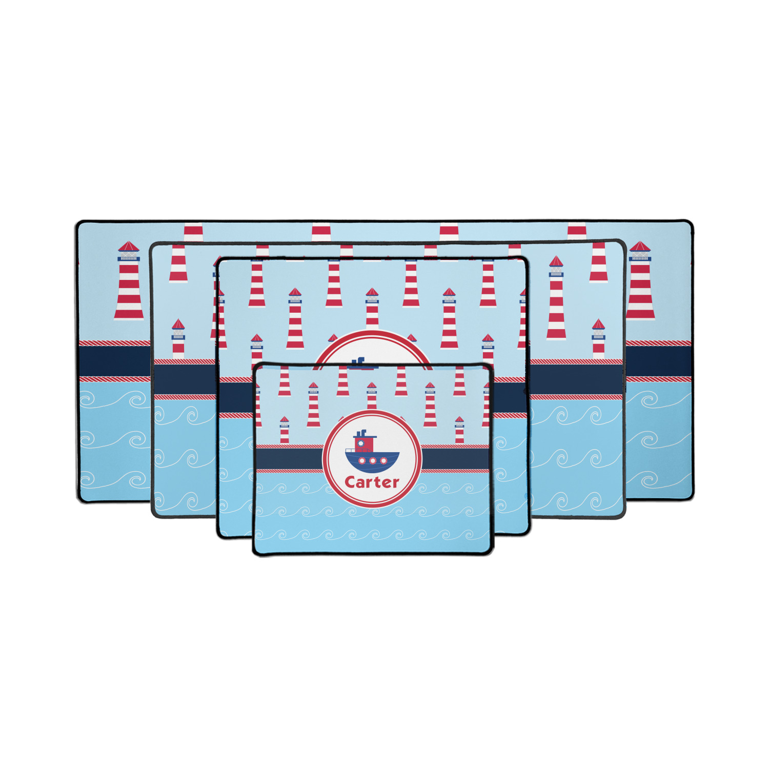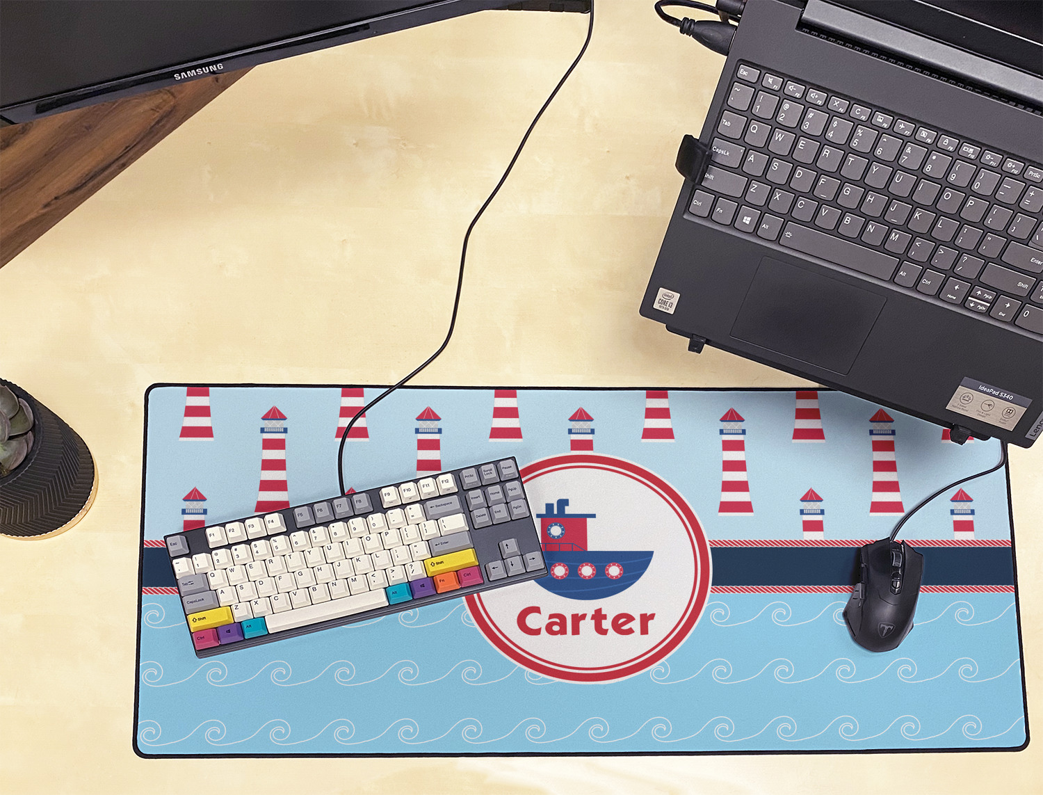 The center focal point of the design is a whimsical coordinating colored tugboat showcased in what looks like a ship's porthole with your personalized name under the tugboat.