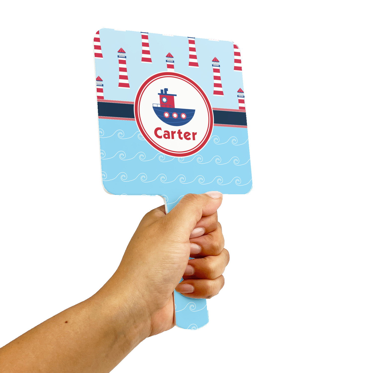 The center focal point of the design is a whimsical coordinating colored tugboat showcased in what looks like a ship's porthole with your personalized name under the tugboat.