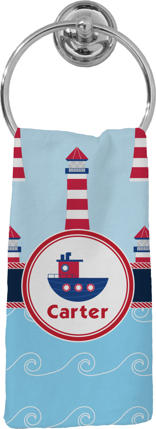 The center focal point of the design is a whimsical coordinating colored tugboat showcased in what looks like a ship's porthole with your personalized name under the tugboat.