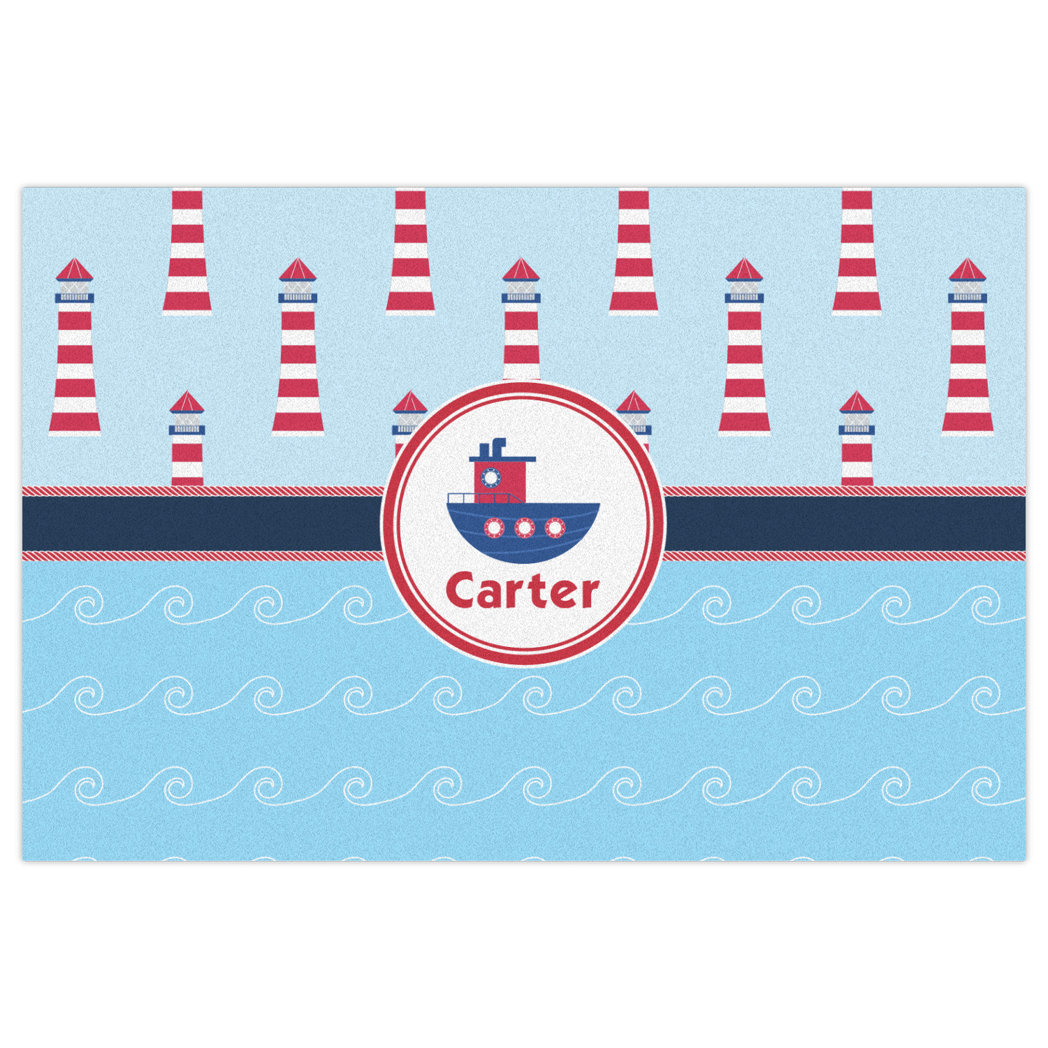The center focal point of the design is a whimsical coordinating colored tugboat showcased in what looks like a ship's porthole with your personalized name under the tugboat.