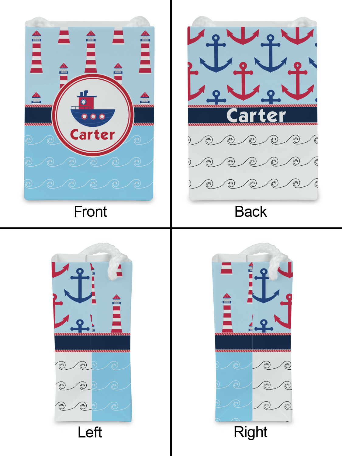 The center focal point of the design is a whimsical coordinating colored tugboat showcased in what looks like a ship's porthole with your personalized name under the tugboat.