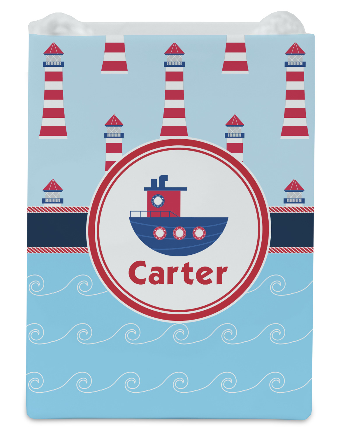 The center focal point of the design is a whimsical coordinating colored tugboat showcased in what looks like a ship's porthole with your personalized name under the tugboat.