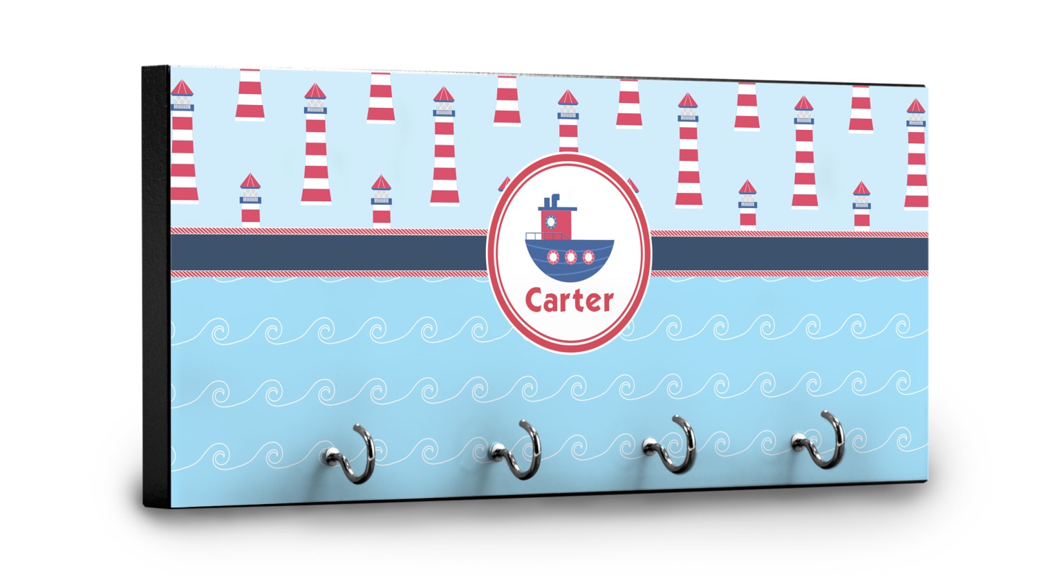 The center focal point of the design is a whimsical coordinating colored tugboat showcased in what looks like a ship's porthole with your personalized name under the tugboat.