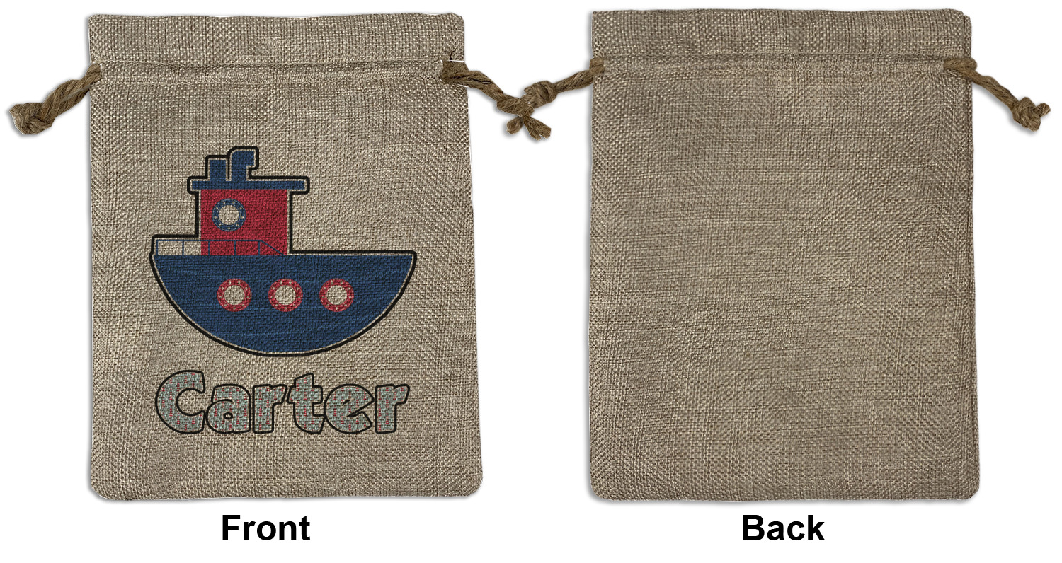We sell our Burlap Gift Bags in 3 variant sized bags. Made with burlap polyester, each personalized bag can be secured with a twine drawstring pull. Your custom design is available to print on one side or both sides - completely up to you! The sizes of the bags measure approximately 4.5" x 6.5" for the smallest size, 6.5" x 8.0" for the medium size, and 6.5" x 13.5" for the large-sized bag.