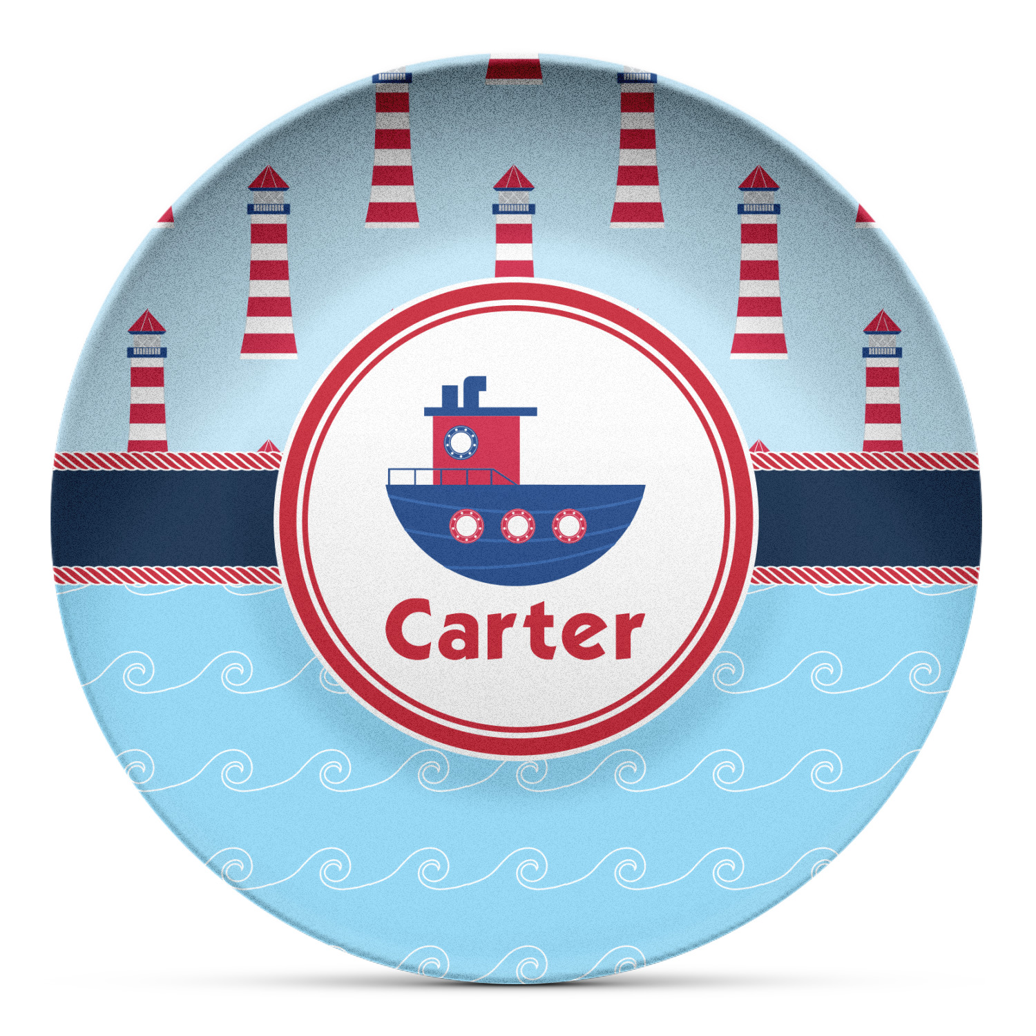 The center focal point of the design is a whimsical coordinating colored tugboat showcased in what looks like a ship's porthole with your personalized name under the tugboat.