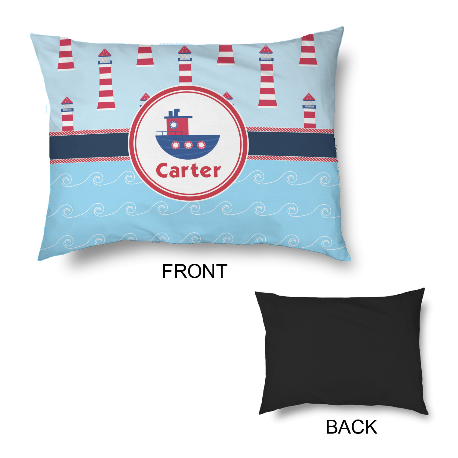 The center focal point of the design is a whimsical coordinating colored tugboat showcased in what looks like a ship's porthole with your personalized name under the tugboat.
