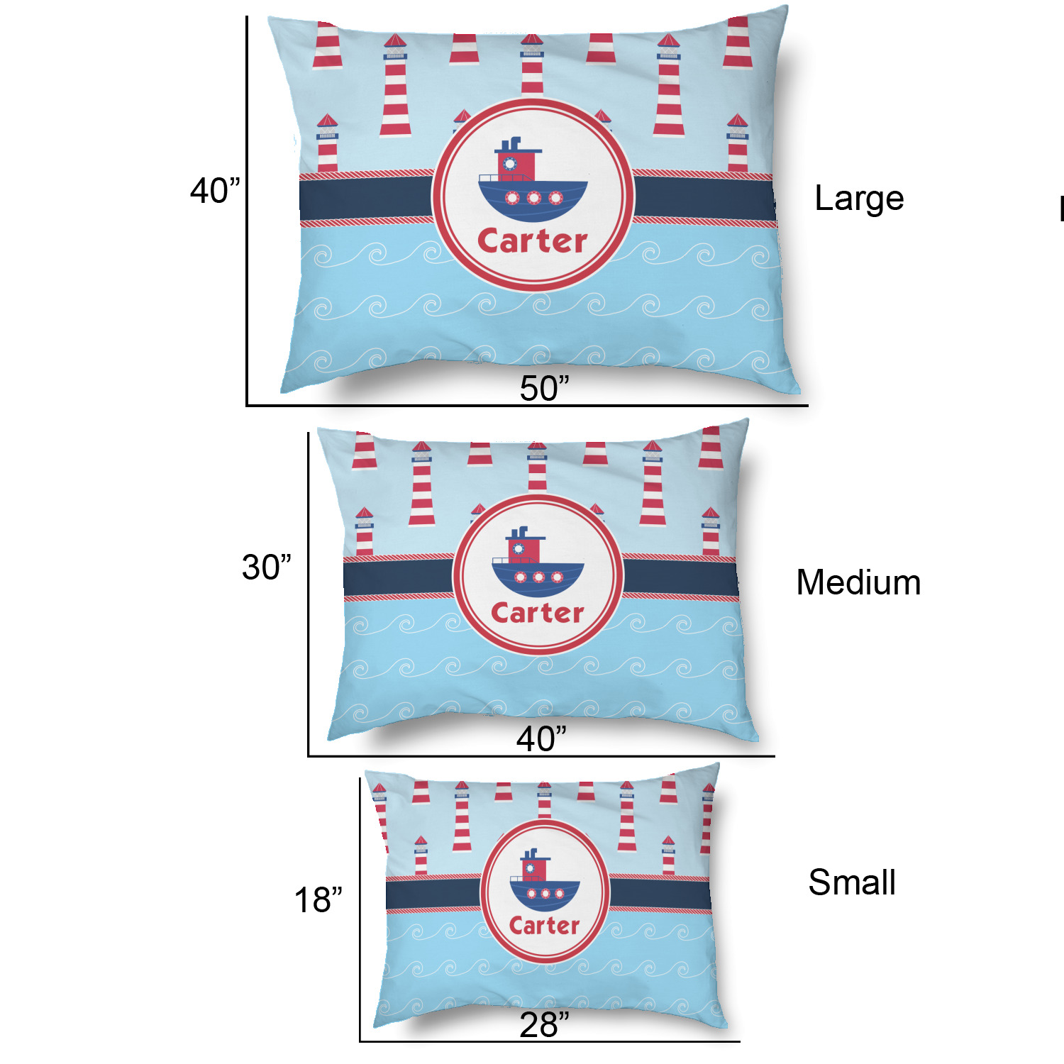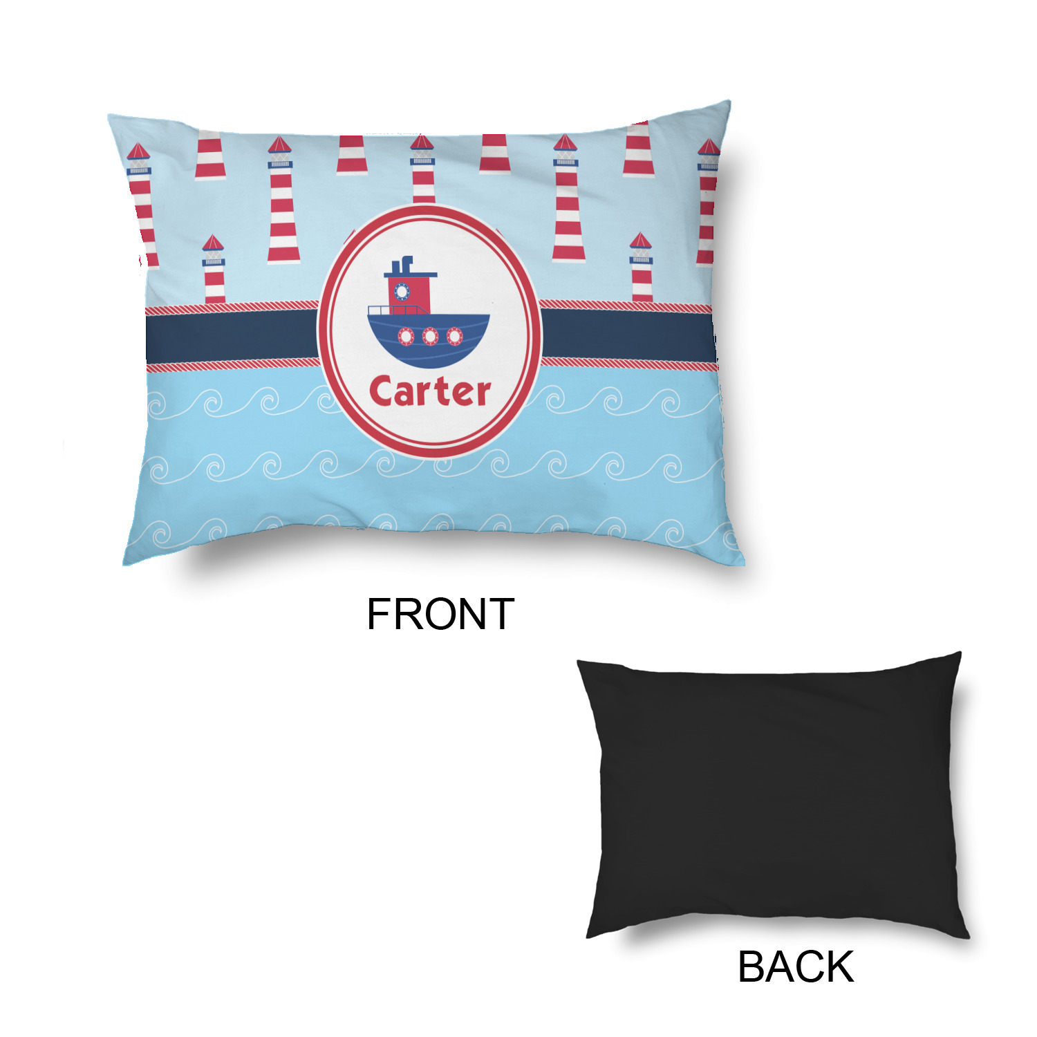 The center focal point of the design is a whimsical coordinating colored tugboat showcased in what looks like a ship's porthole with your personalized name under the tugboat.