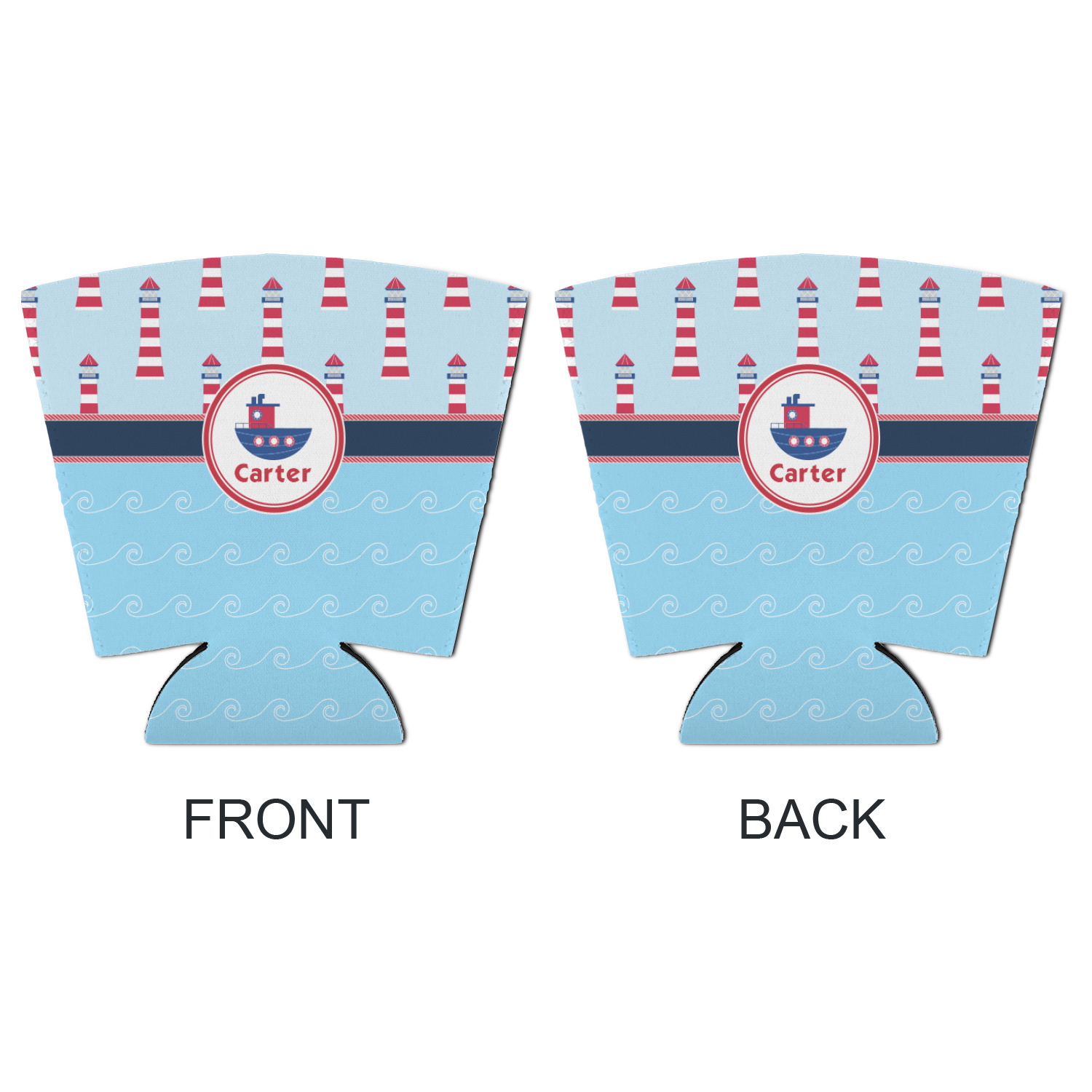 The center focal point of the design is a whimsical coordinating colored tugboat showcased in what looks like a ship's porthole with your personalized name under the tugboat.