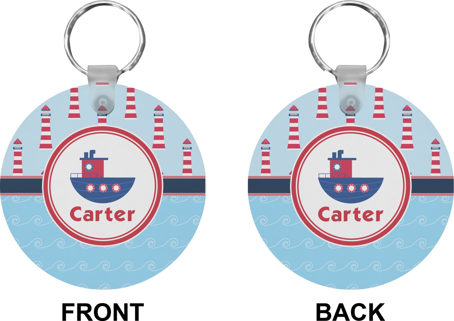 The center focal point of the design is a whimsical coordinating colored tugboat showcased in what looks like a ship's porthole with your personalized name under the tugboat.