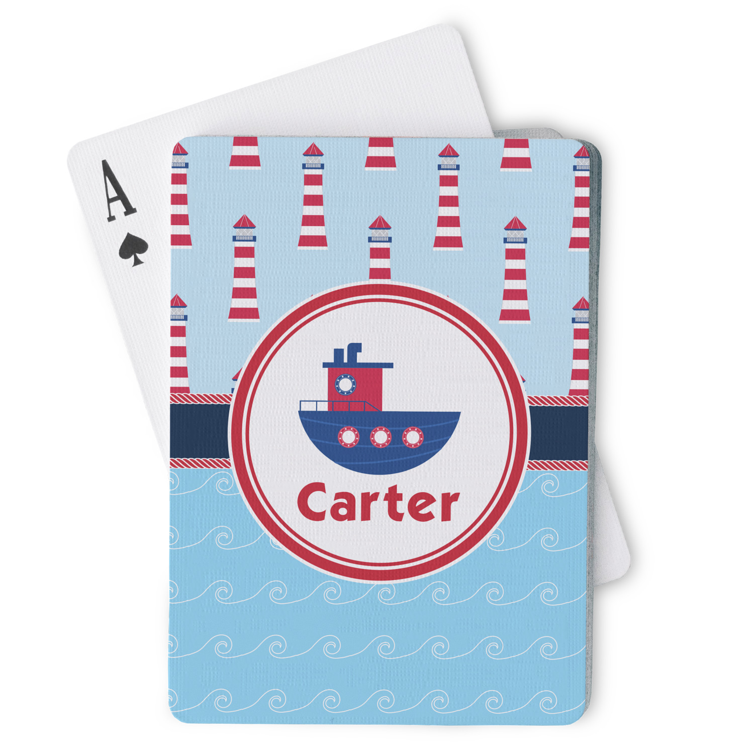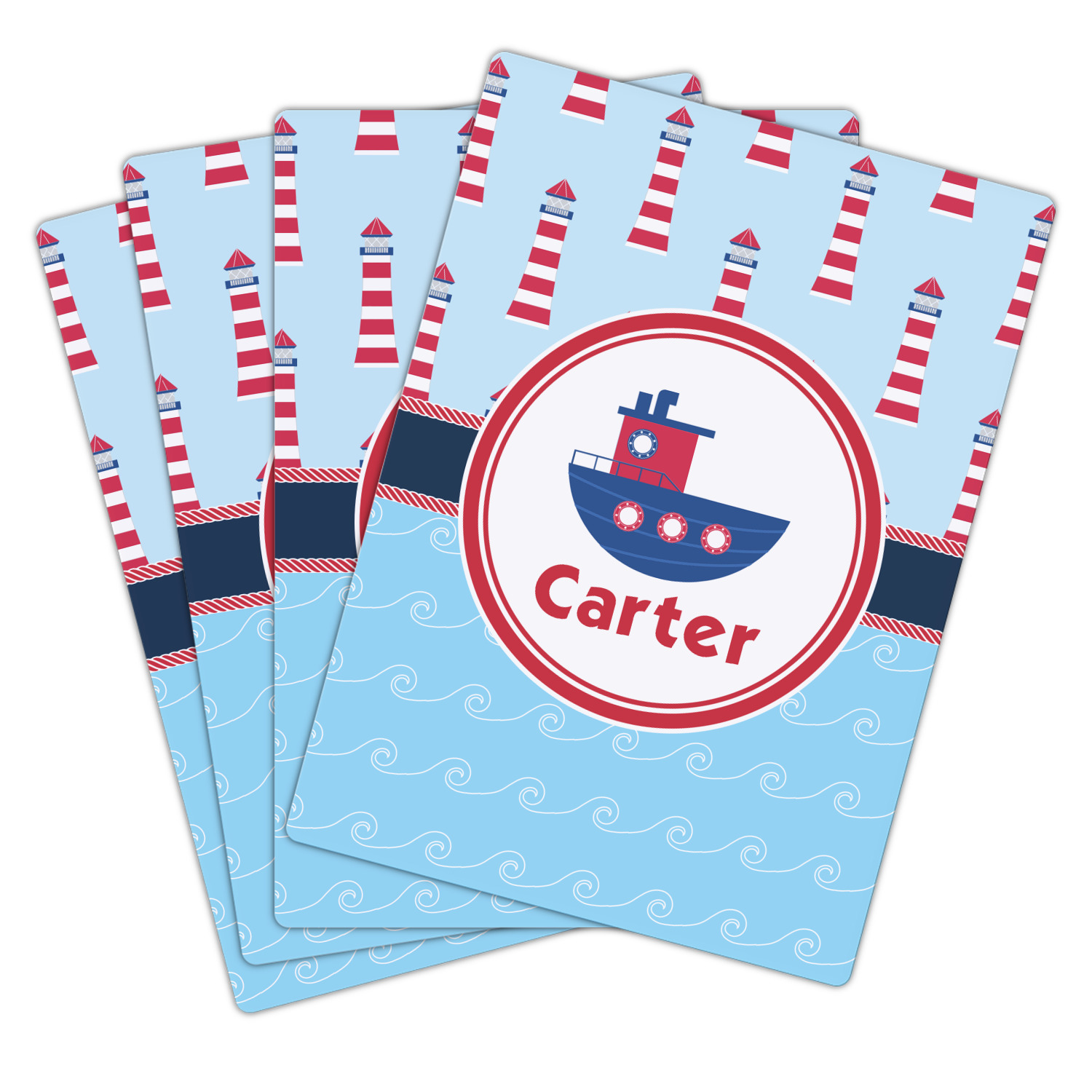 The center focal point of the design is a whimsical coordinating colored tugboat showcased in what looks like a ship's porthole with your personalized name under the tugboat.