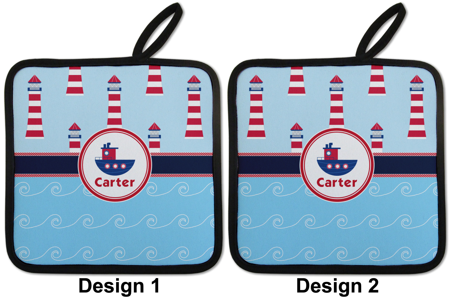 Our personalized pot holders feature a neoprene front that displays your personalization in vibrant colors. The backing of the hot pot holder is rubberized; the textured backing allows you to have a great grip when using this custom pot holder. The two materials are joined with a sleek, black trim, and the holder also includes an attached loop for hanging and storage. The pot holder is approximately 8.75 inches by 8.75 inches and 0.25 inches tall, while the fabric loop is 2.5 inches long. You can purchase a kitchen pot holder by itself or as a set of 2. We also offer a set including one pot holder and one oven mitt.
