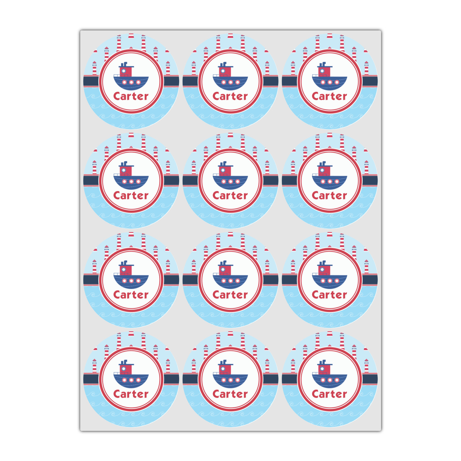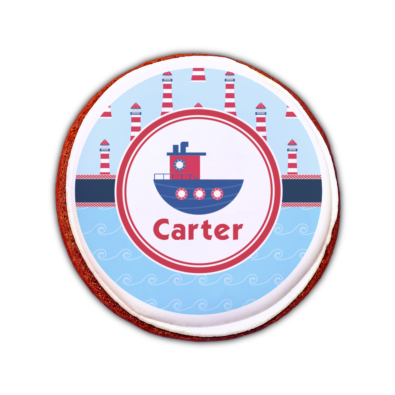 The center focal point of the design is a whimsical coordinating colored tugboat showcased in what looks like a ship's porthole with your personalized name under the tugboat.