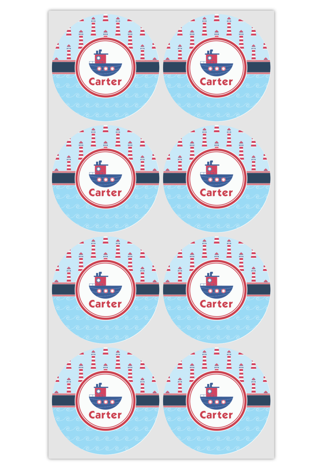The center focal point of the design is a whimsical coordinating colored tugboat showcased in what looks like a ship's porthole with your personalized name under the tugboat.