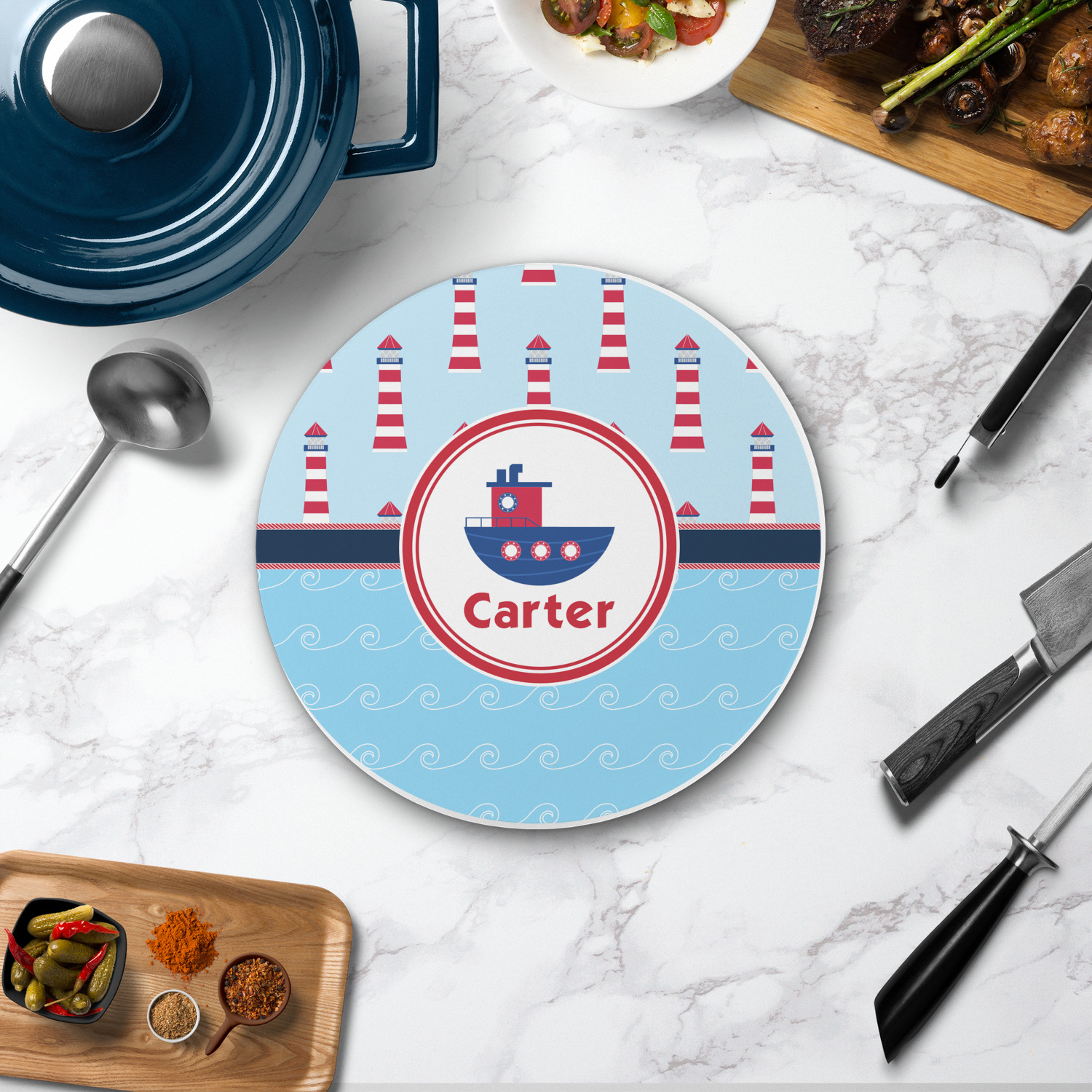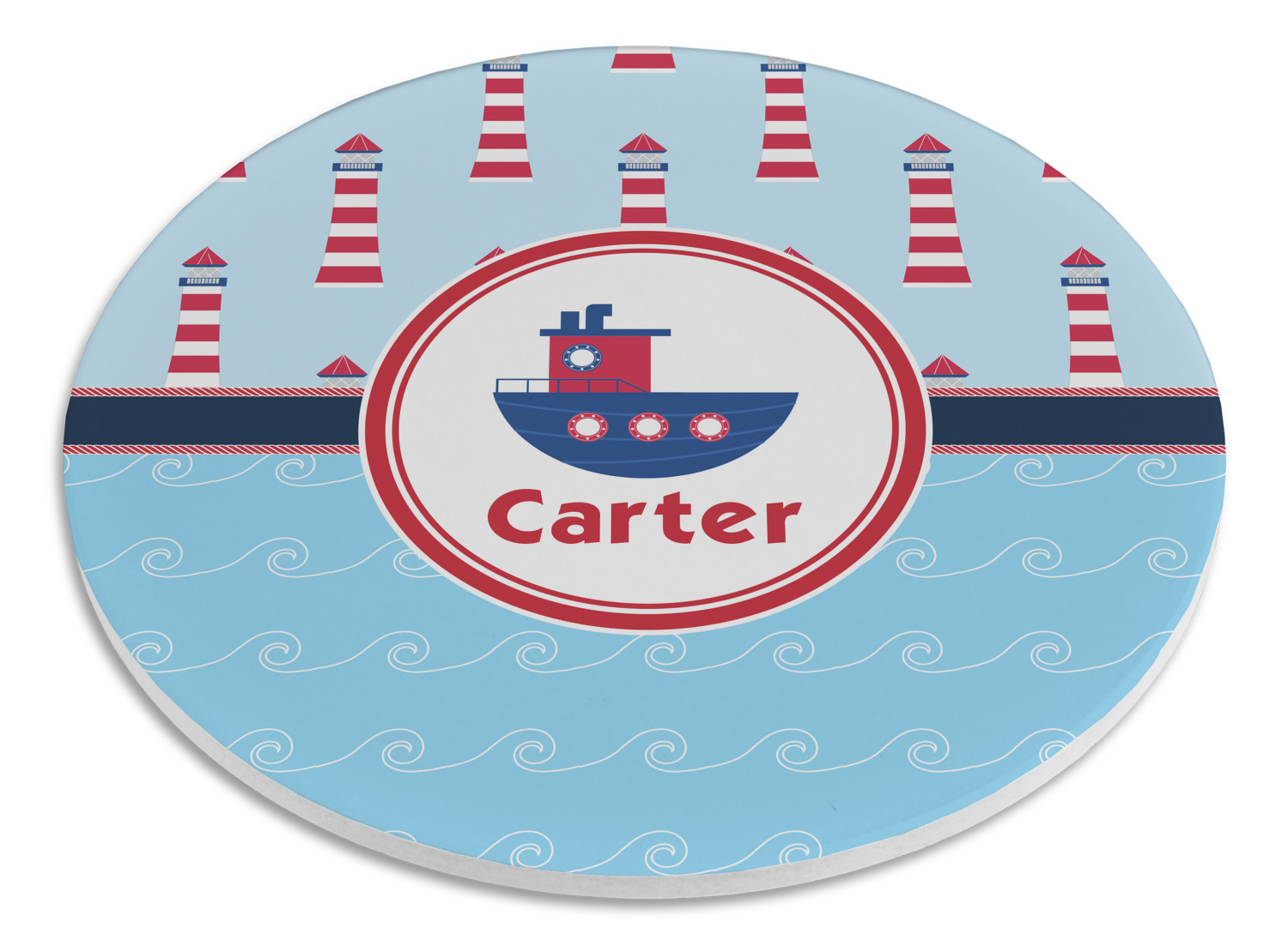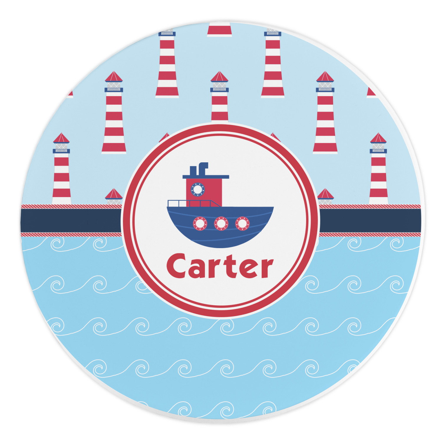 The center focal point of the design is a whimsical coordinating colored tugboat showcased in what looks like a ship's porthole with your personalized name under the tugboat.