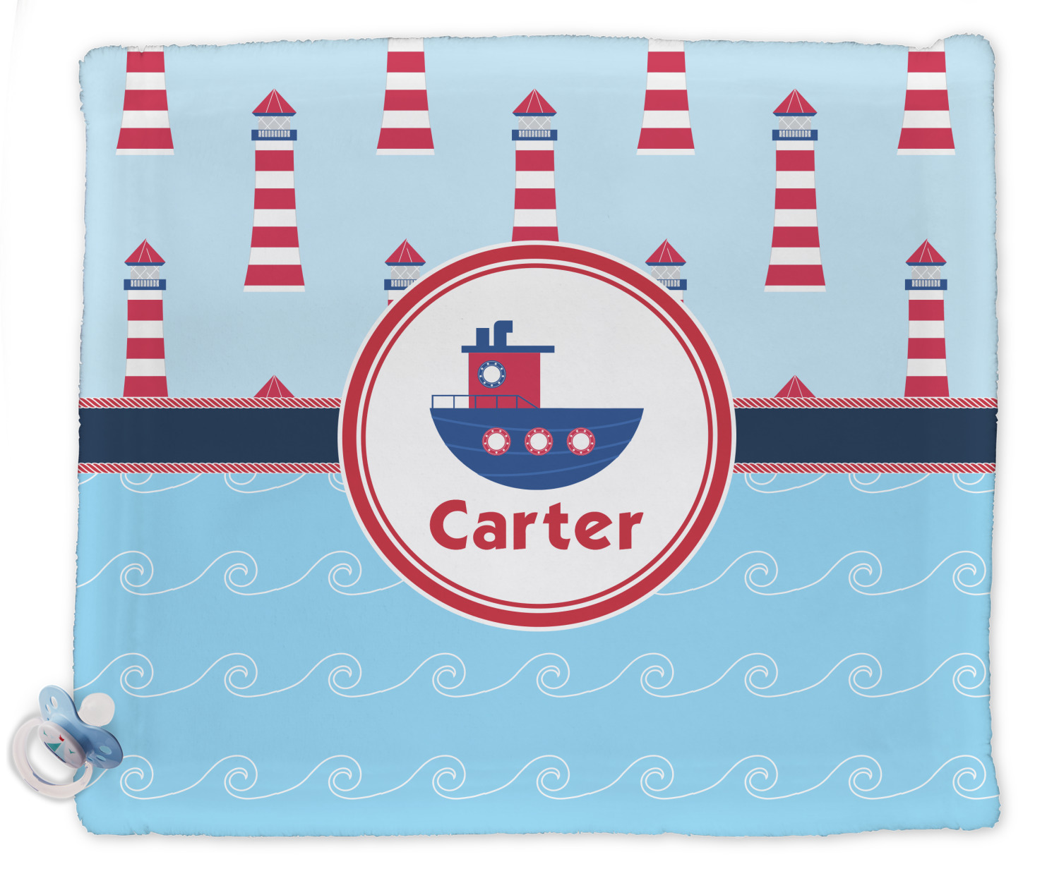 The center focal point of the design is a whimsical coordinating colored tugboat showcased in what looks like a ship's porthole with your personalized name under the tugboat.