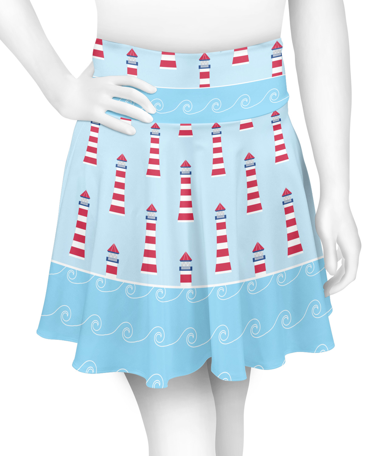 This fun nautical design features a versatile light blue background with a lighthouse pattern on the top with coordinating light blue ocean waves on the bottom. A red stripe with a nautical darker blue rope through the middle brings both patterns together to create a beautiful nautical seascape design.