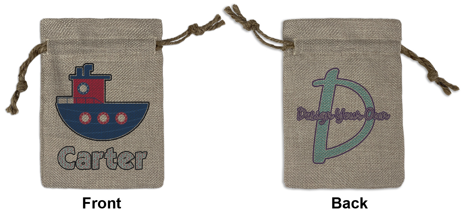 We sell our Burlap Gift Bags in 3 variant sized bags. Made with burlap polyester, each personalized bag can be secured with a twine drawstring pull. Your custom design is available to print on one side or both sides - completely up to you! The sizes of the bags measure approximately 4.5" x 6.5" for the smallest size, 6.5" x 8.0" for the medium size, and 6.5" x 13.5" for the large-sized bag.