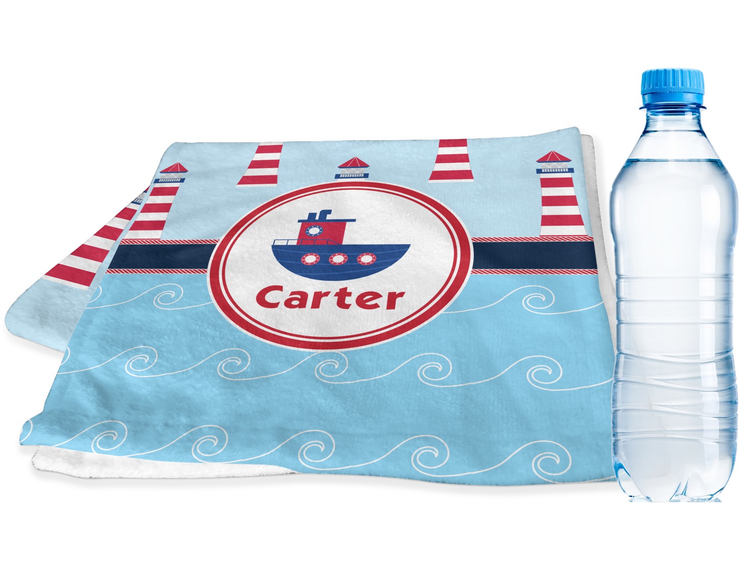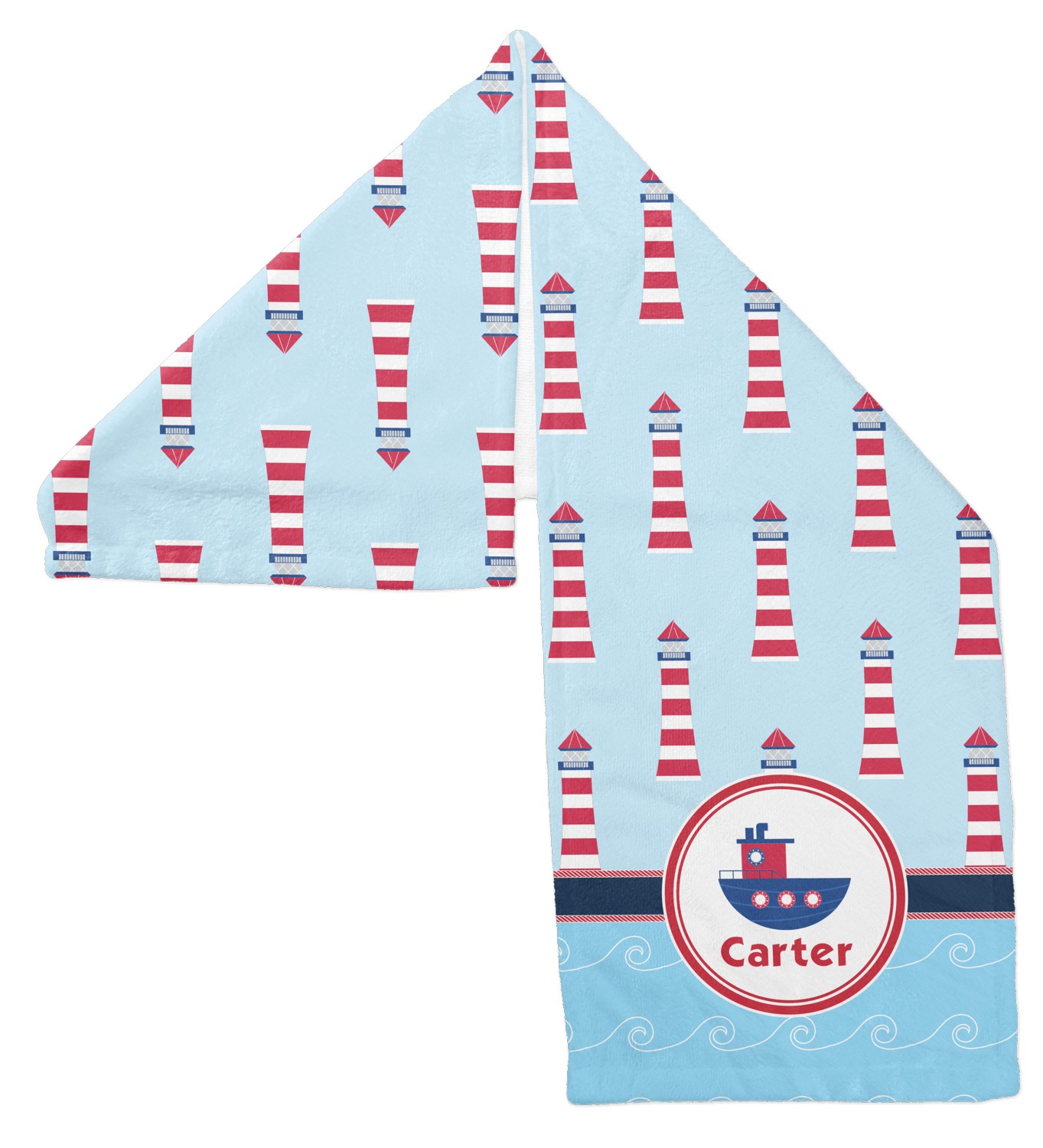 The center focal point of the design is a whimsical coordinating colored tugboat showcased in what looks like a ship's porthole with your personalized name under the tugboat.