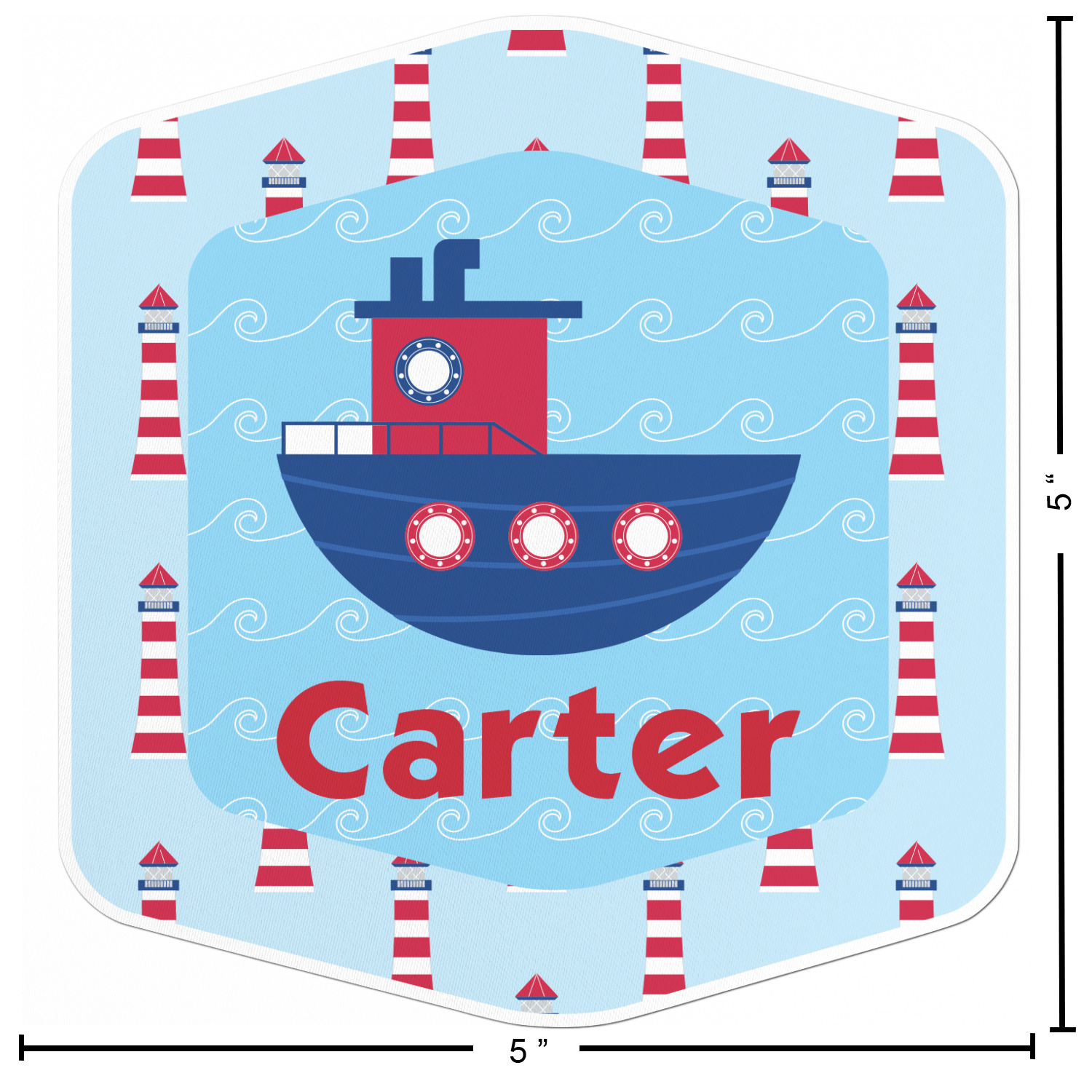 The center focal point of the design is a whimsical coordinating colored tugboat showcased in what looks like a ship's porthole with your personalized name under the tugboat.