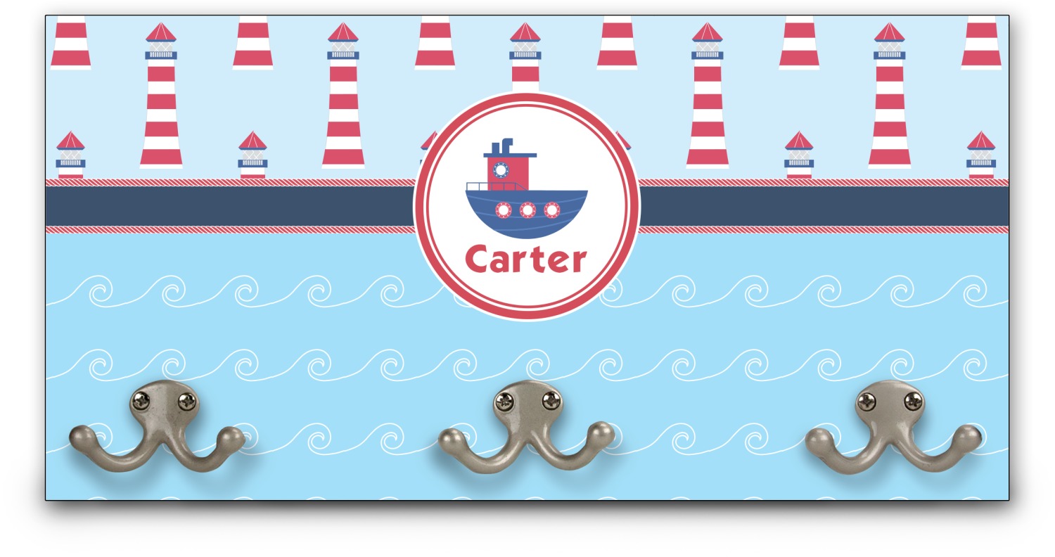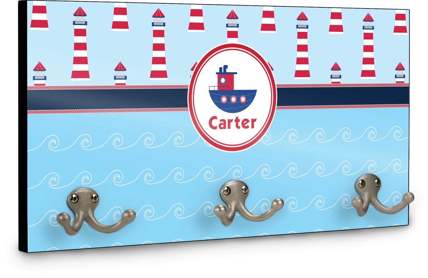 The center focal point of the design is a whimsical coordinating colored tugboat showcased in what looks like a ship's porthole with your personalized name under the tugboat.