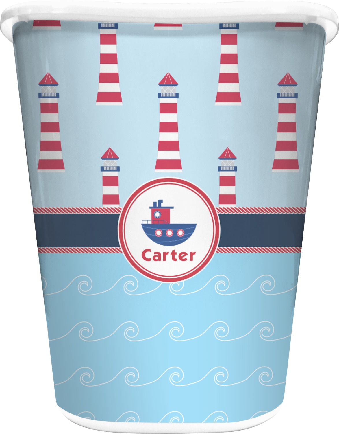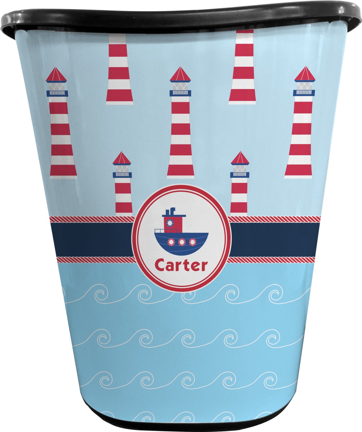 The center focal point of the design is a whimsical coordinating colored tugboat showcased in what looks like a ship's porthole with your personalized name under the tugboat.