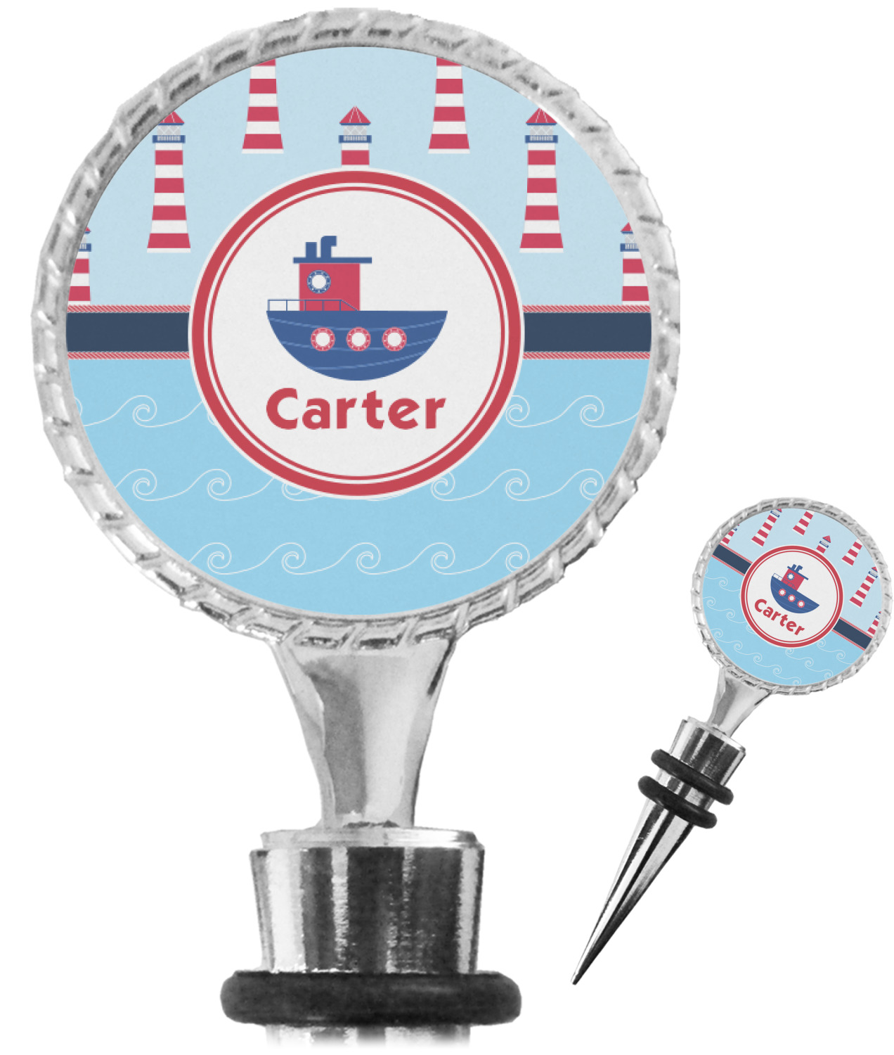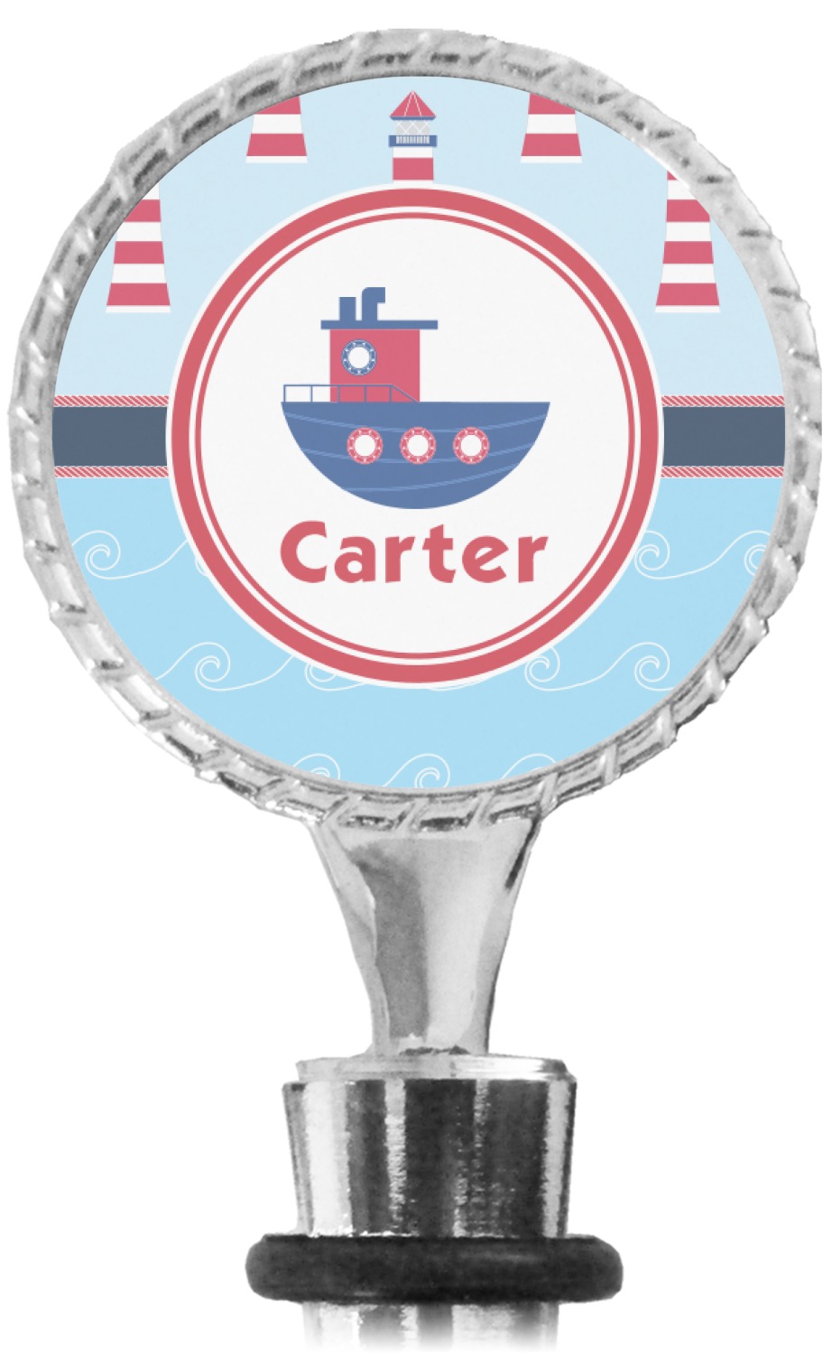 The center focal point of the design is a whimsical coordinating colored tugboat showcased in what looks like a ship's porthole with your personalized name under the tugboat.
