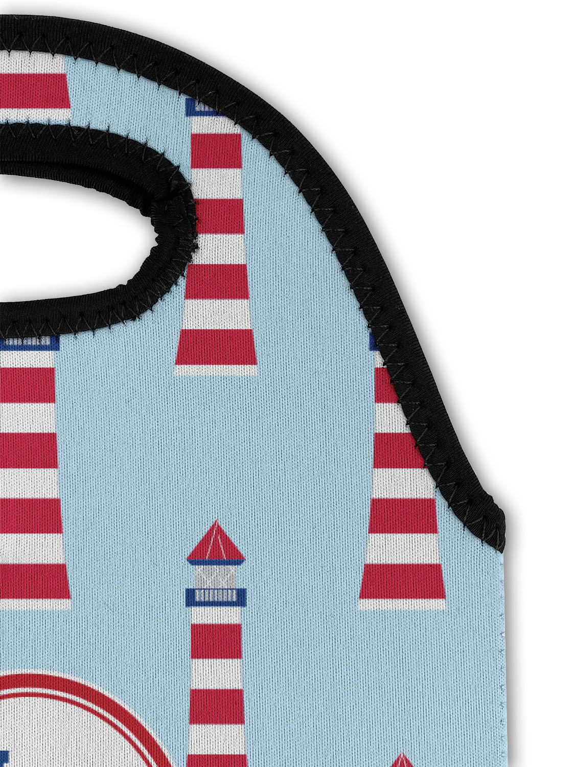 This fun nautical design features a versatile light blue background with a lighthouse pattern on the top with coordinating light blue ocean waves on the bottom. A red stripe with a nautical darker blue rope through the middle brings both patterns together to create a beautiful nautical seascape design.