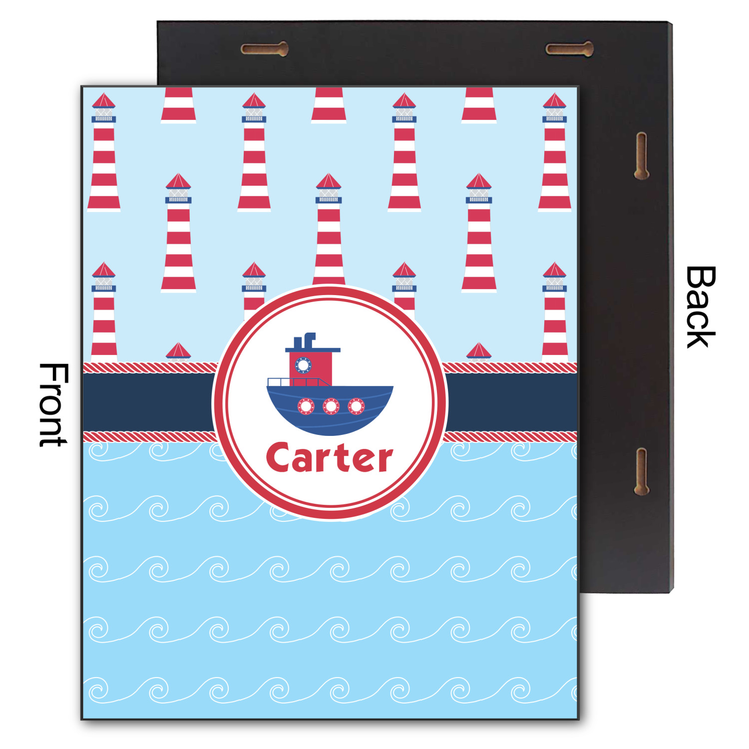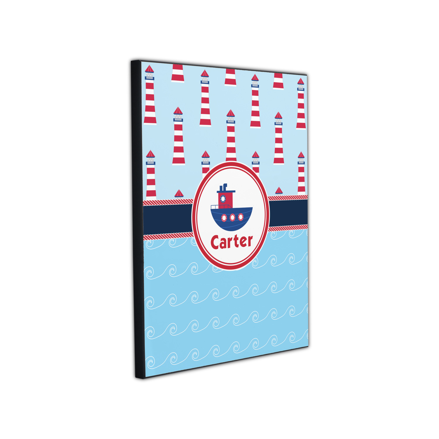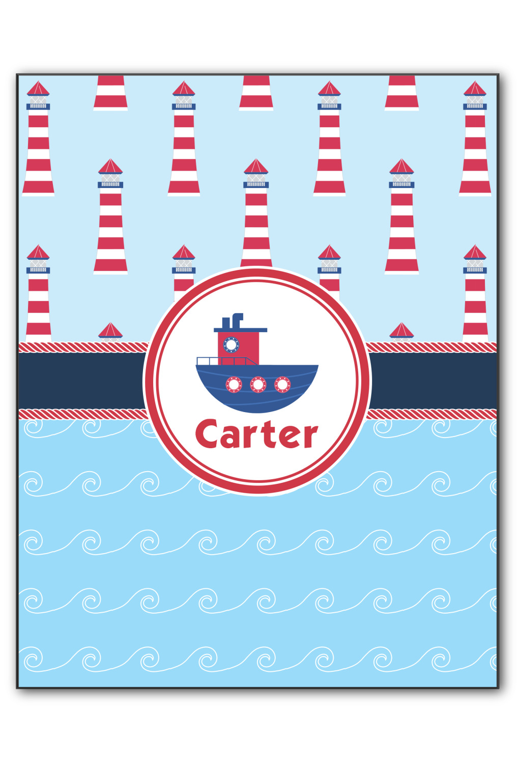 The center focal point of the design is a whimsical coordinating colored tugboat showcased in what looks like a ship's porthole with your personalized name under the tugboat.