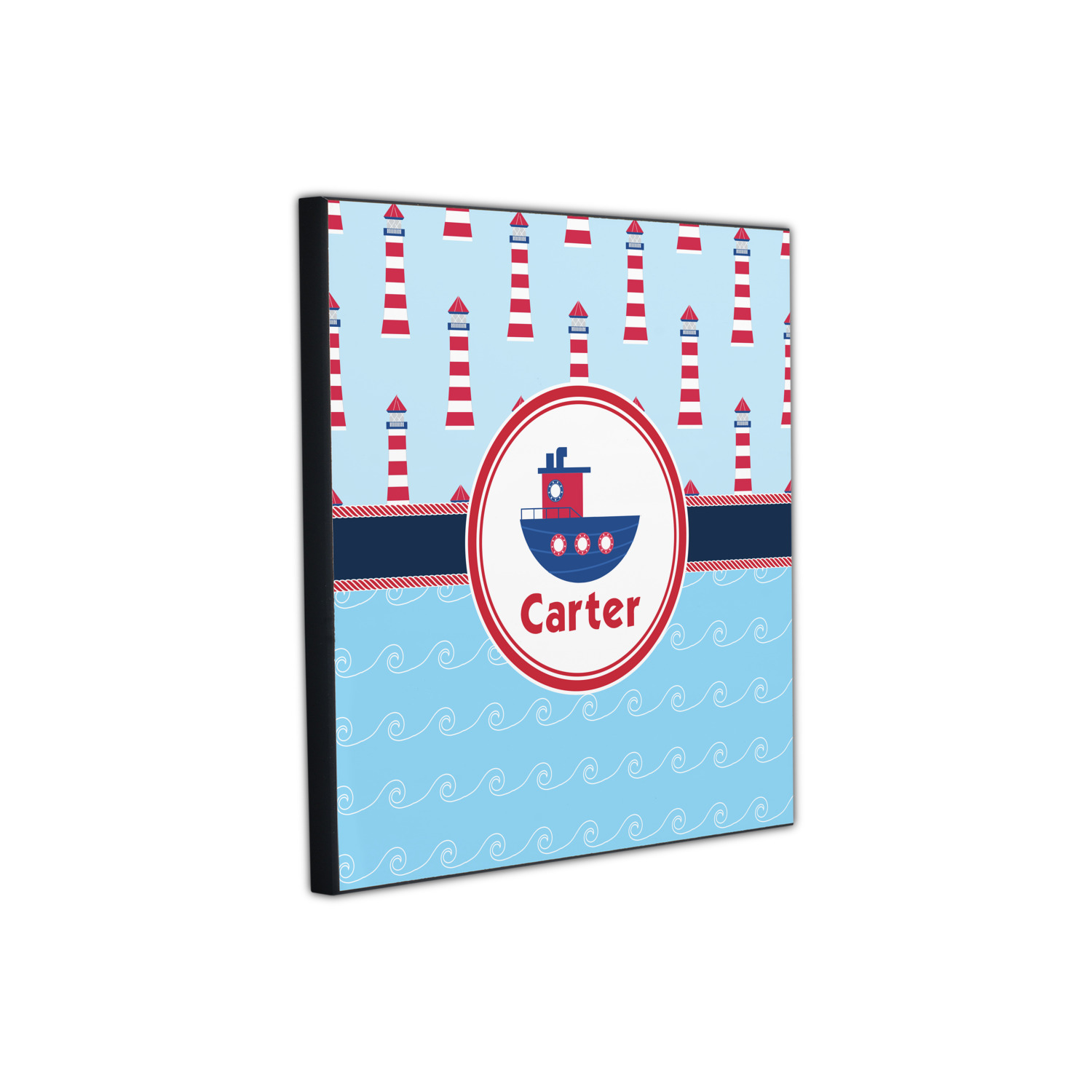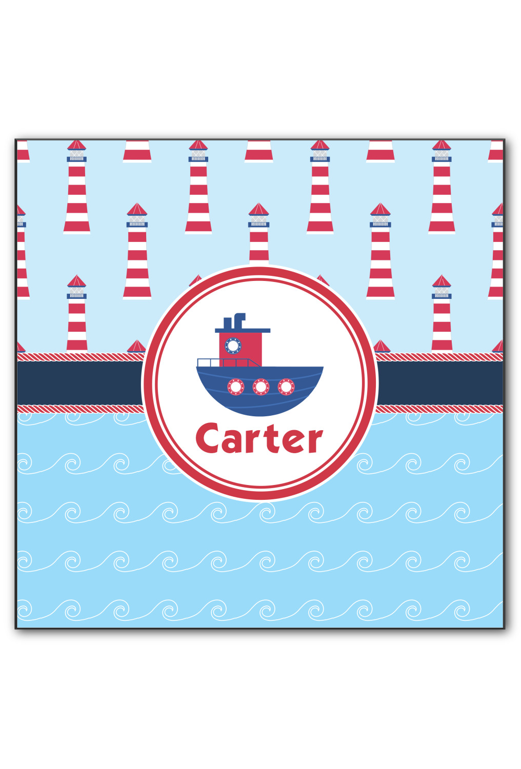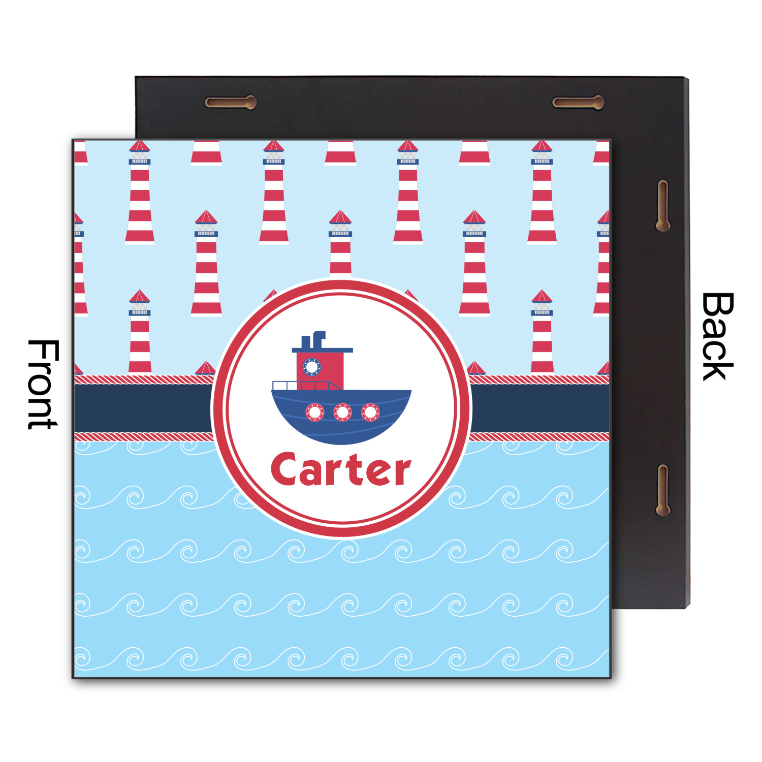 The center focal point of the design is a whimsical coordinating colored tugboat showcased in what looks like a ship's porthole with your personalized name under the tugboat.