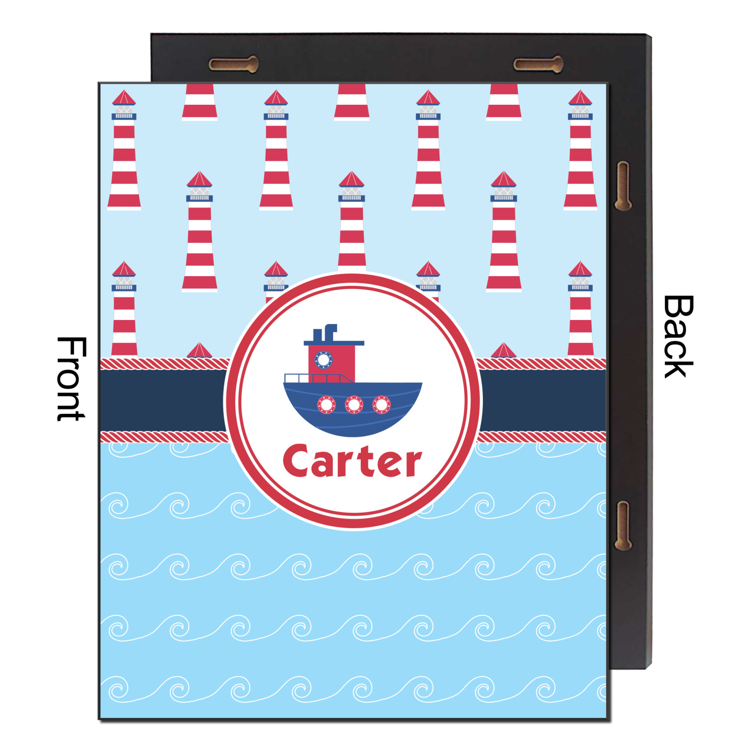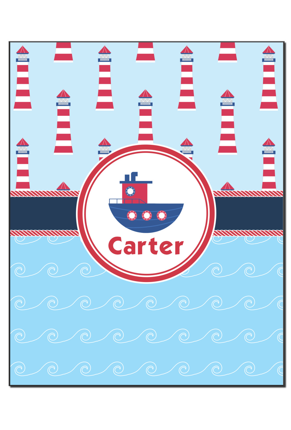 The center focal point of the design is a whimsical coordinating colored tugboat showcased in what looks like a ship's porthole with your personalized name under the tugboat.