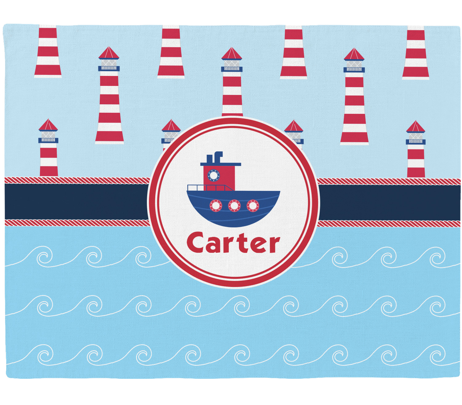 The center focal point of the design is a whimsical coordinating colored tugboat showcased in what looks like a ship's porthole with your personalized name under the tugboat.