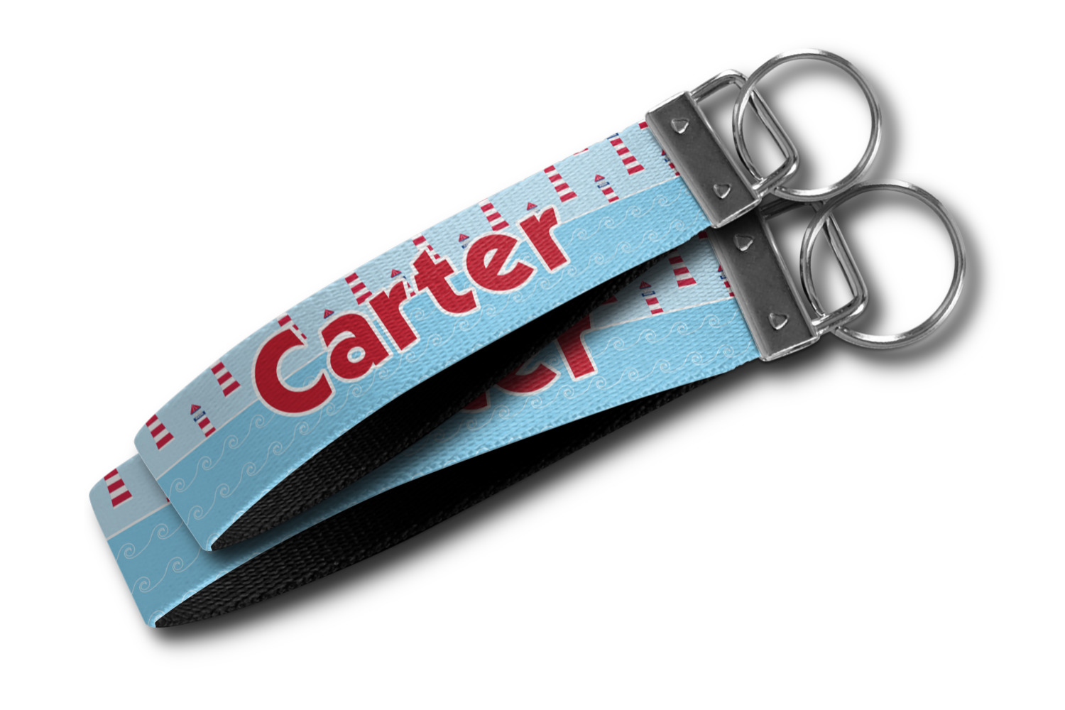 These key fob keychains are made from a polyester weave, right here in the USA. They feature a silver, metal clasp, attached to a round keyring. The piece gives the personalized wristlet a beautiful, finished look. Your customized design is printed on the outside of the keychain strap. We carry these wristlets in two sizes: small, which is 5 inches in width, and large, which is 5.5 inches in width.