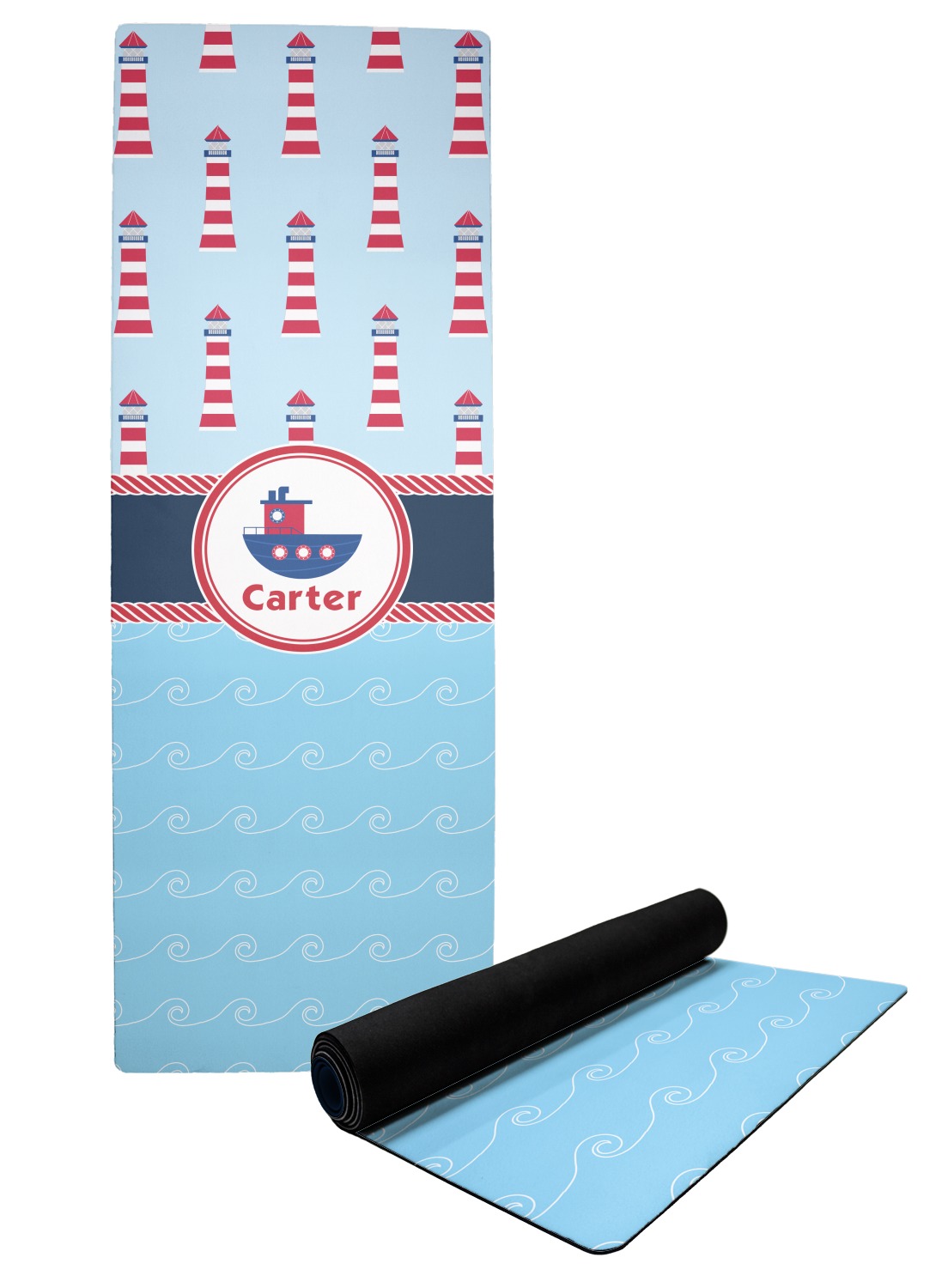The center focal point of the design is a whimsical coordinating colored tugboat showcased in what looks like a ship's porthole with your personalized name under the tugboat.