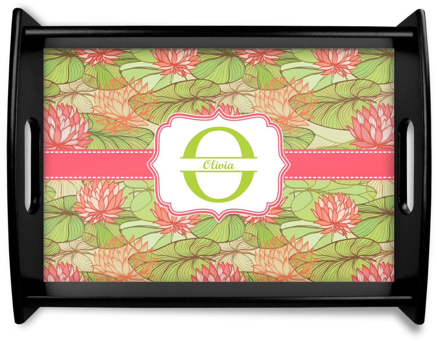 This serving tray with handles features square edges and two rounded sides, creating a very modern look. Each side is fabricated from a beautifully cut, natural wood. The bottom of the interior of the tray displays your customized design in bright, vibrant color. The tray is sold in both a black color and a natural wood look. Each variation of the wood serving tray has two sizes: Small, which is 14" x 10" x 2.25", and Large, which is 19.5" x 13.5" x 2.75".