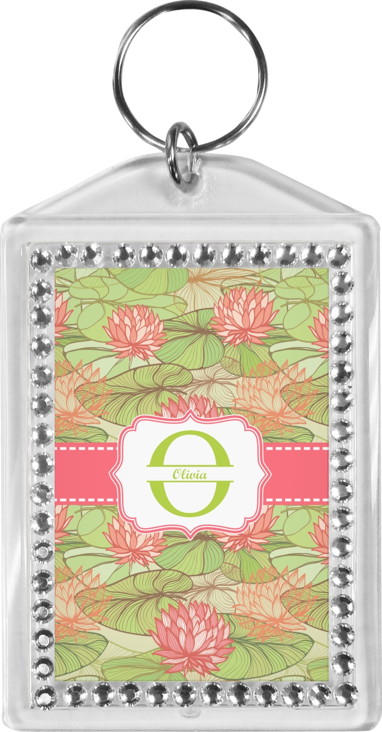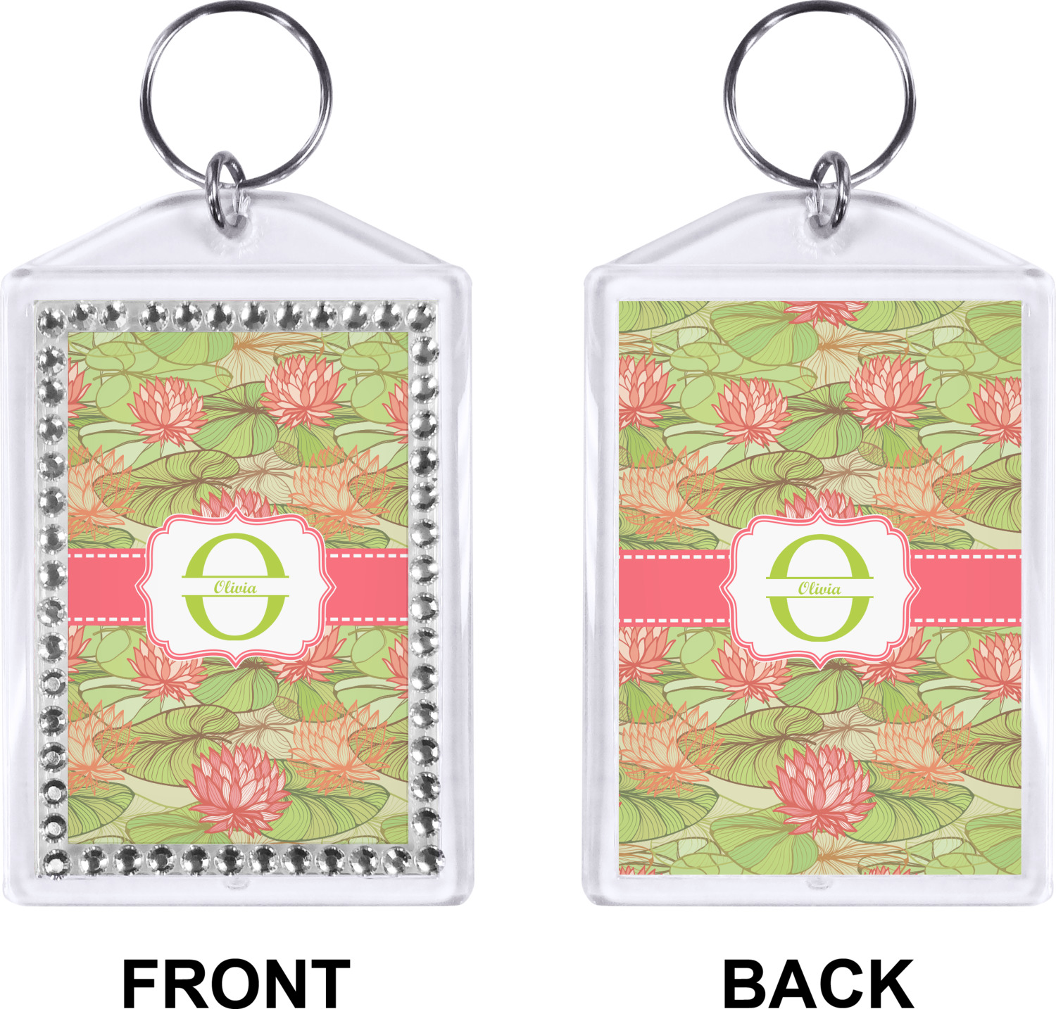 Our personalized keychains have a bold, rectangular shape, outlined by a series of shimmering rhinestones. A metal, split keyring is included with your purchase, and an additional metal hoop allows for attachment of the keychain to the split ring. This unique keychain measures at about 3.75 by 2.5 inches. We print your customized design(s) across both the back and front of this keychain.