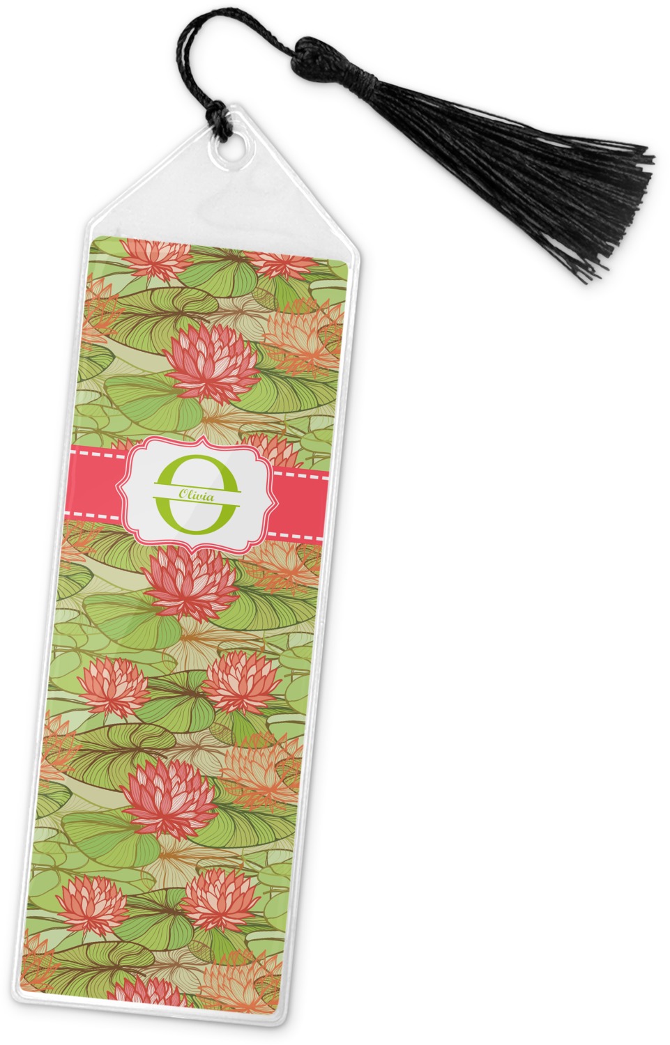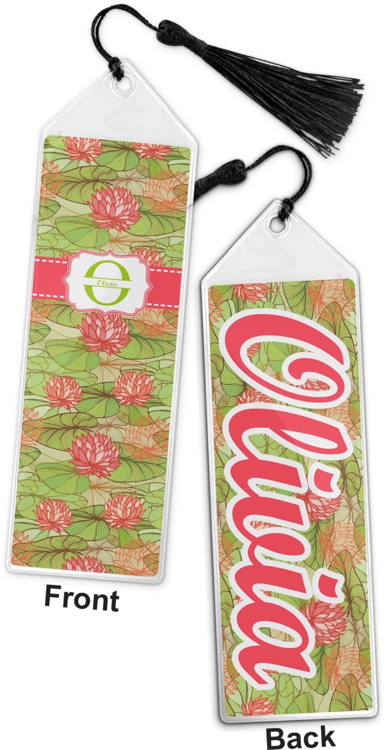 Your personalized bookmark is made of a sturdy, clear vinyl, and is approximately 7.5" x 2.25". We display your personalization on vinyl inserts that are placed on both sides. Accompanying each book marker is a black, fringe tassel that attaches to the reinforced, triangular header.